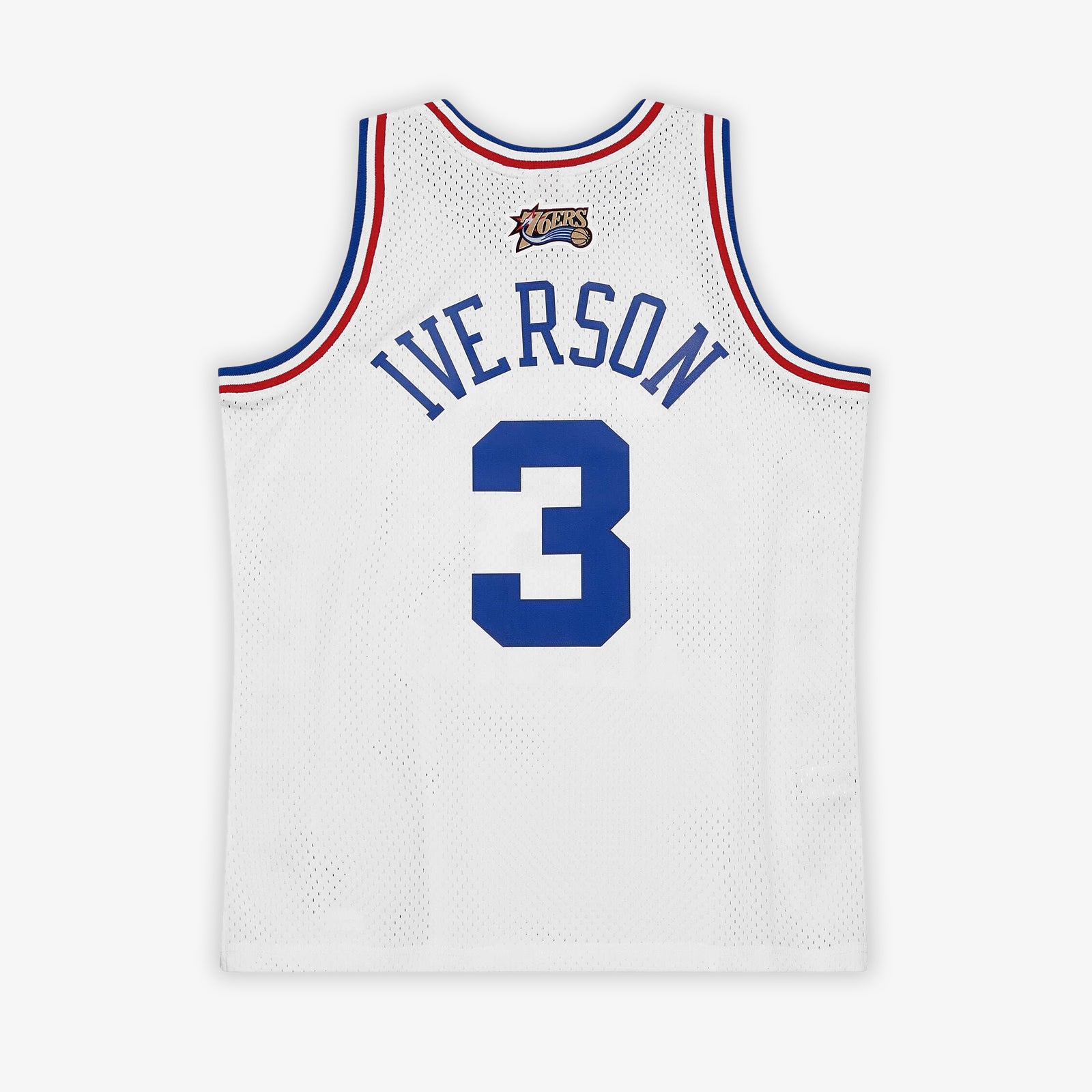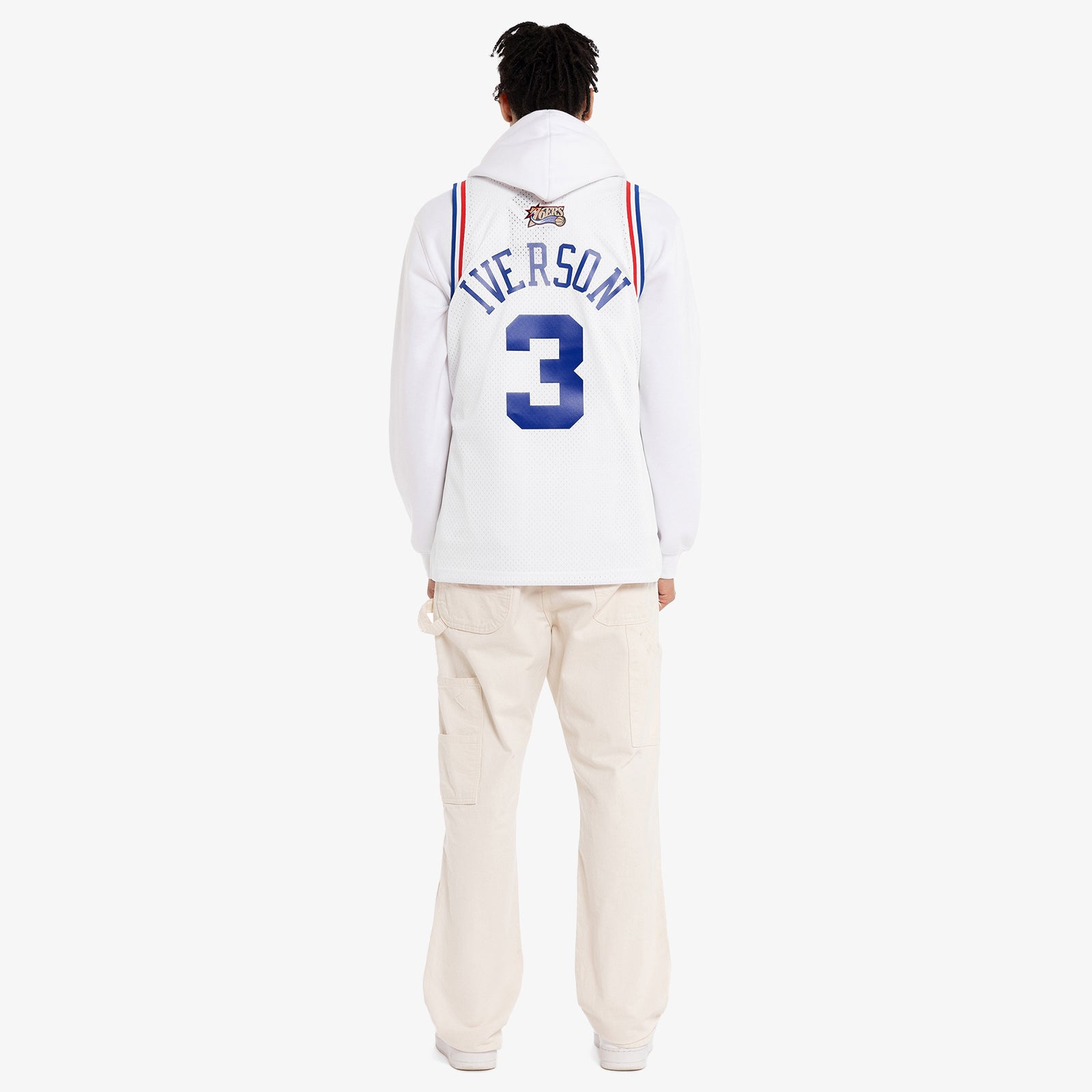 - Mitchell & Ness HWC Swingman woven jock tag and woven label 2003 ALLEN IVERSON at lower left front.