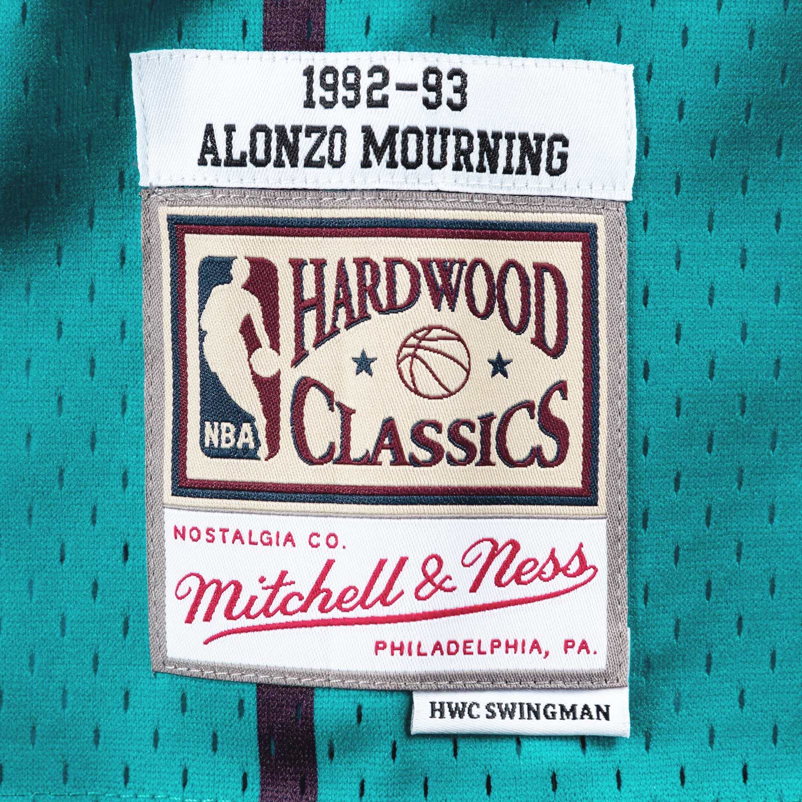 - Mitchell & Ness HWC Swingman woven jock tag and woven label 1992-93 ALONZO MOURNING at lower left front.