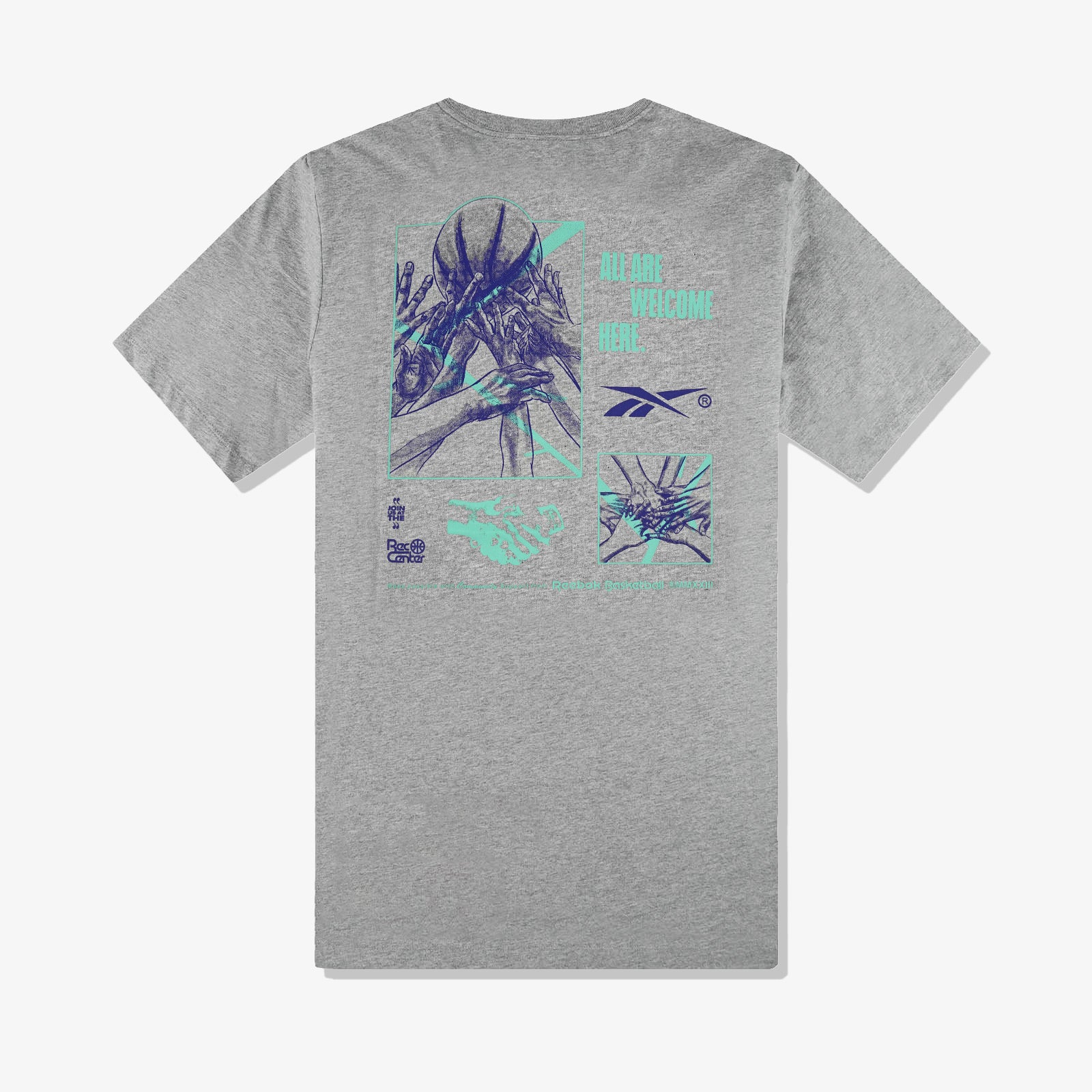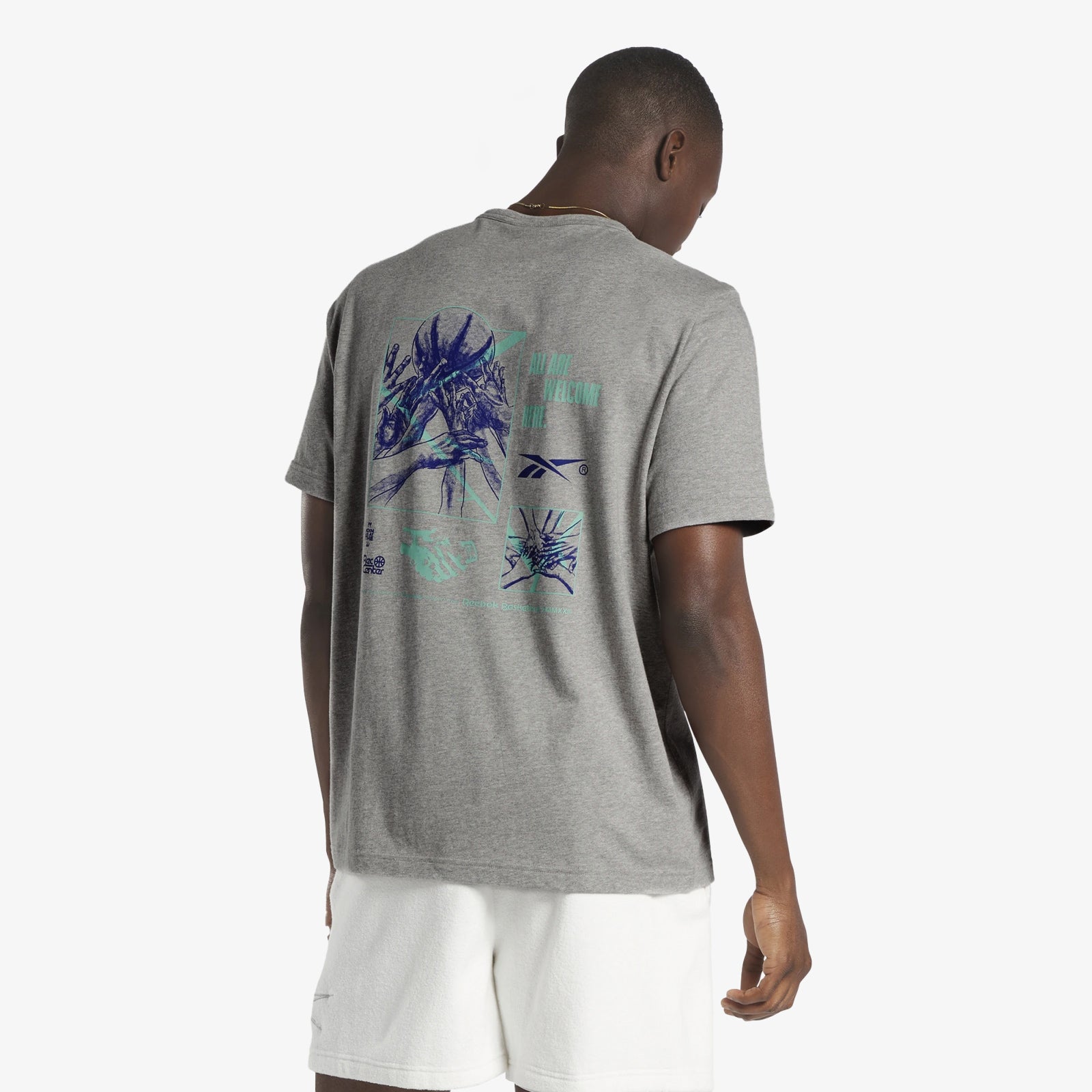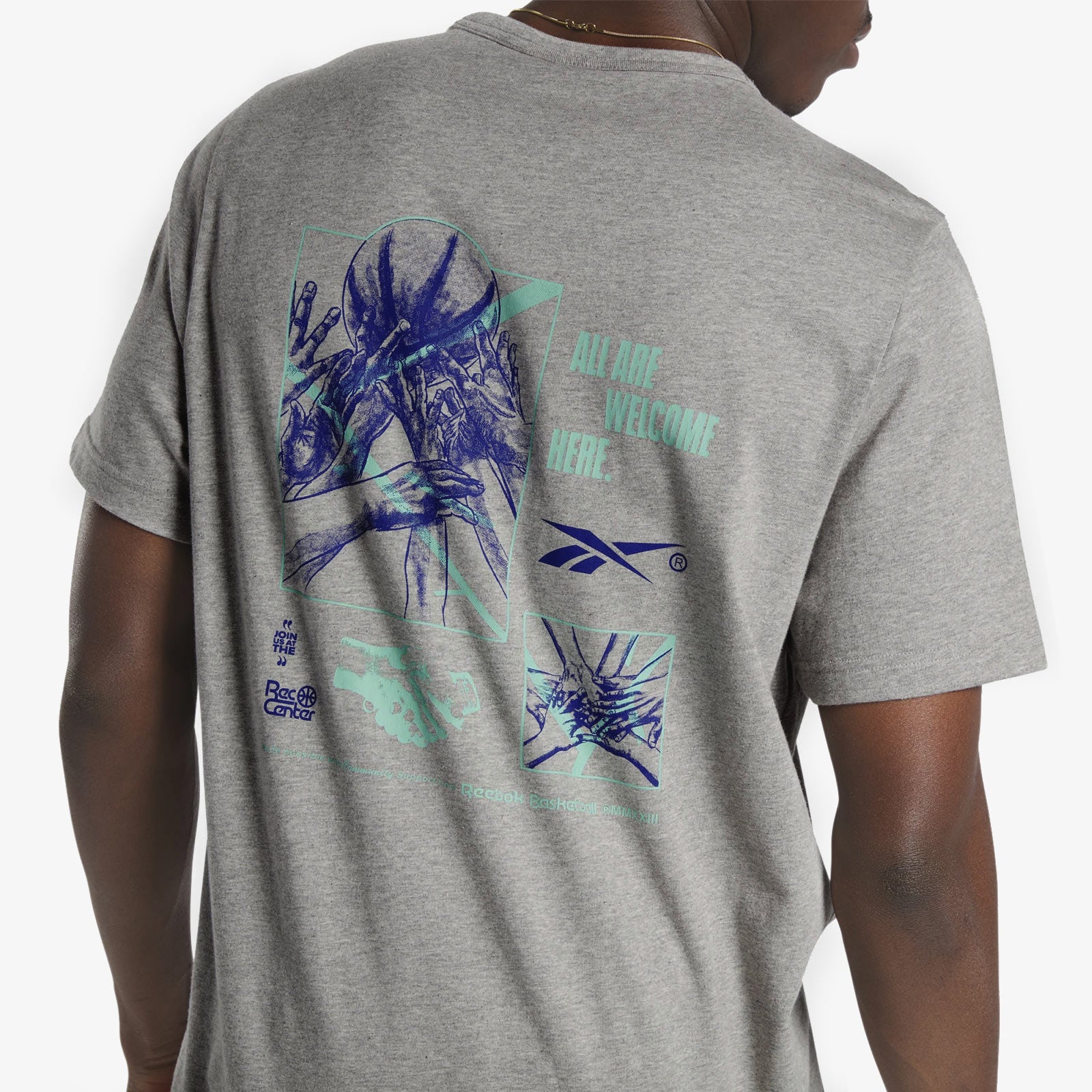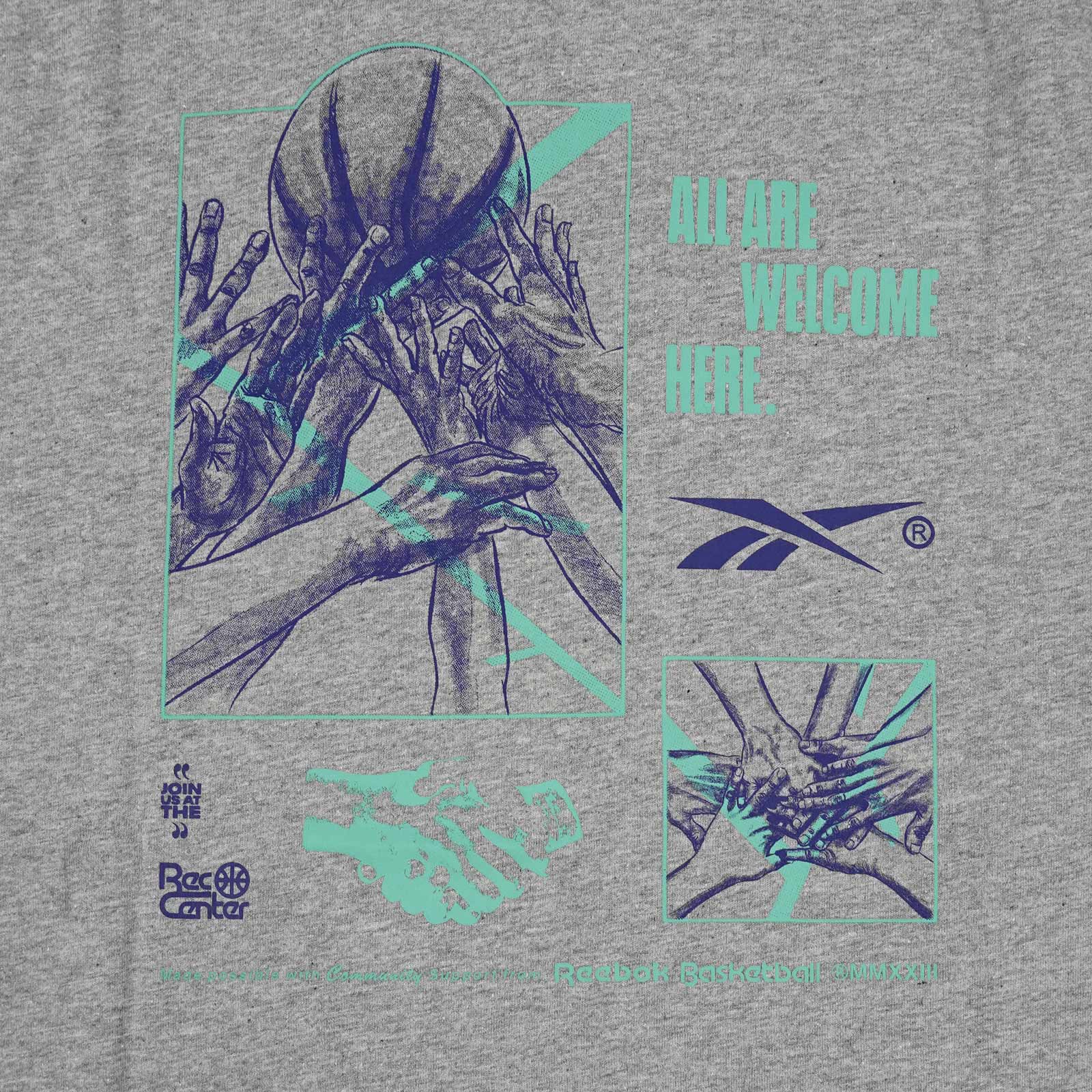 Join us at the Rec Center, "All Are Welcome Here" grey tee celebrating the community around the game. The basketball court welcomes people from all walks of life. This men's Reebok t-shirt keeps that spirit alive with a graphic promoting a community spirit. Wear it to shoot around or show your hoops DNA around friends.