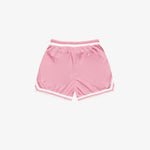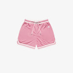 Pink women's basketball shorts with blue and black trimmings, styled for any occasion.