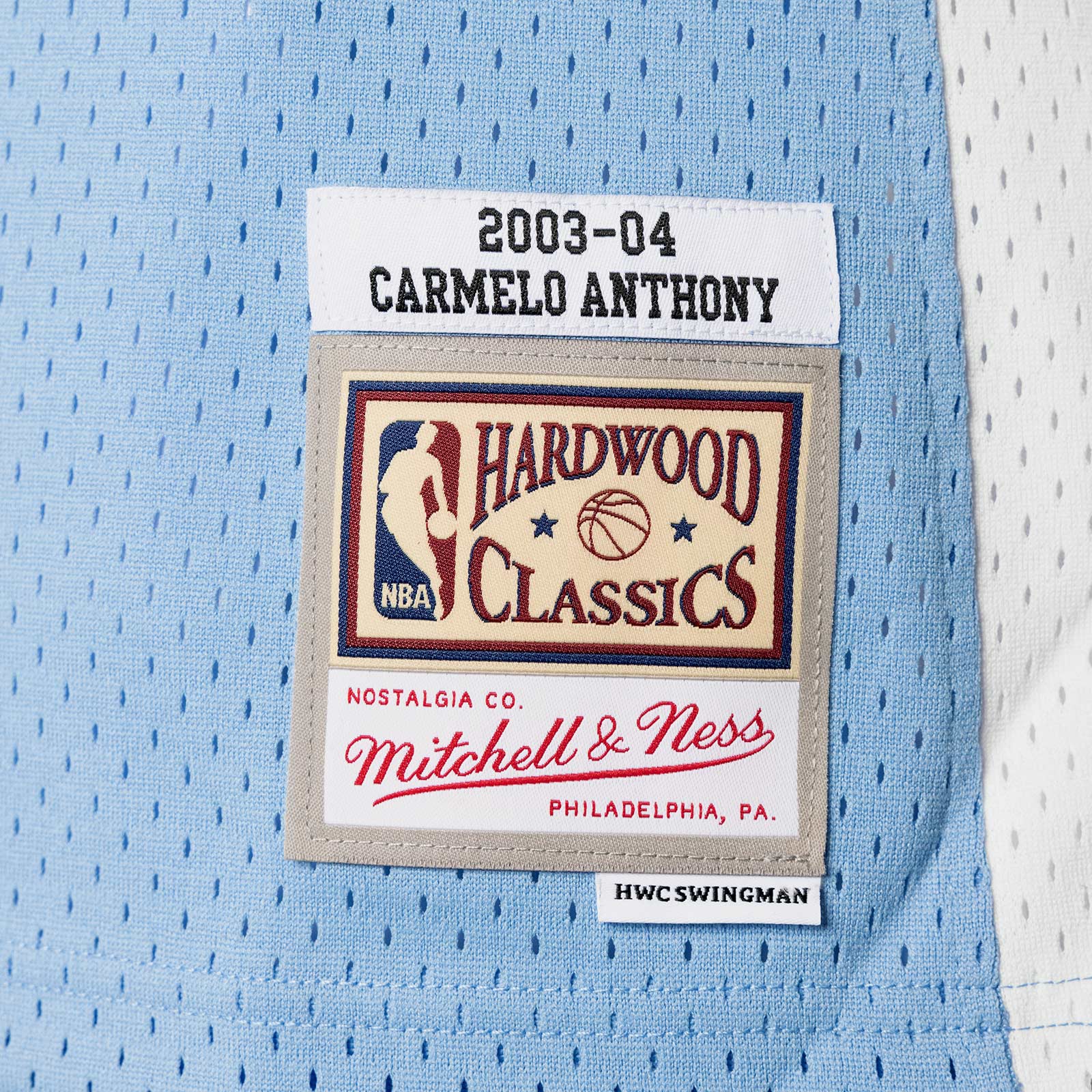 - Mitchell & Ness HWC Swingman woven jock tag and woven label 2003-04 CARMELO ANTHONY at lower left front.