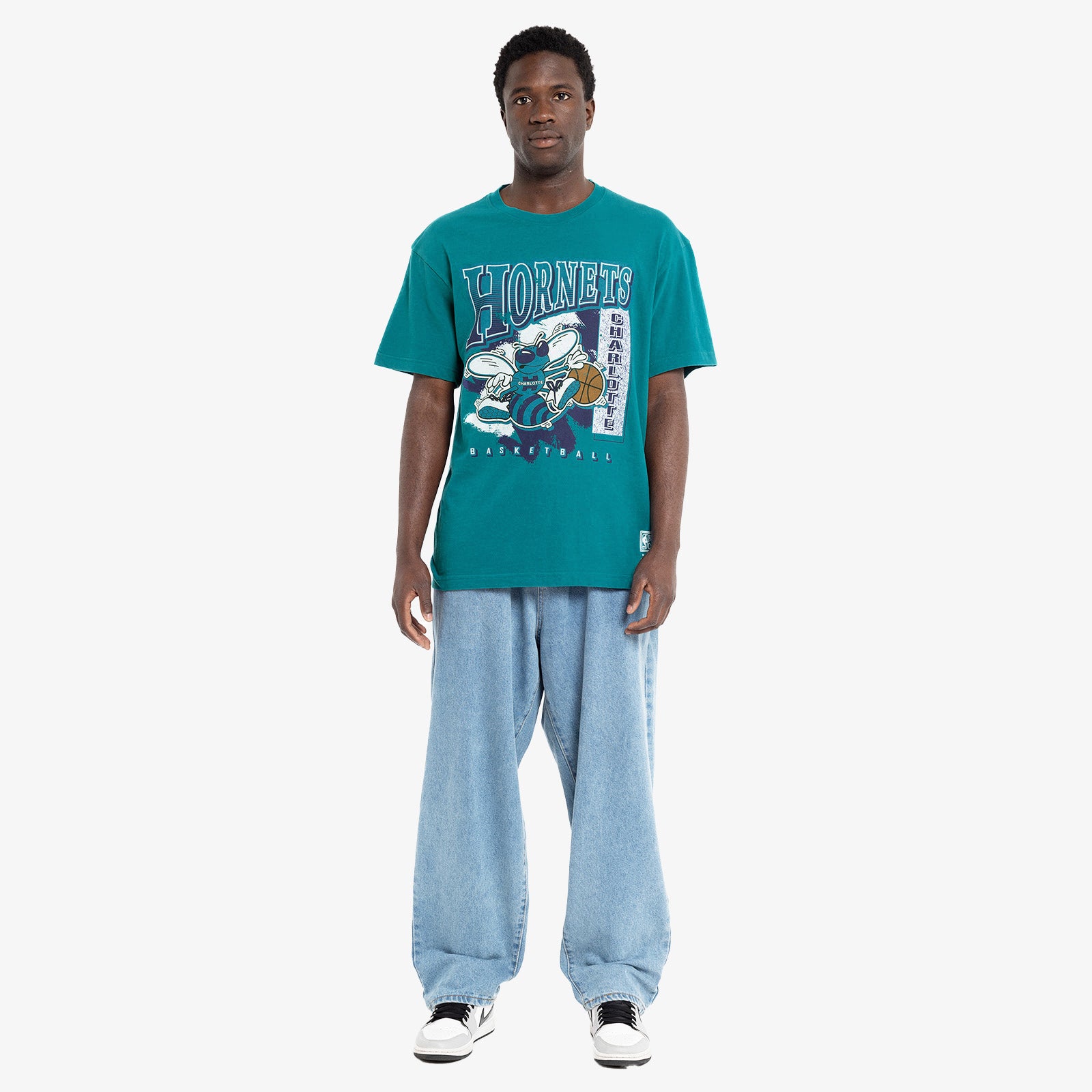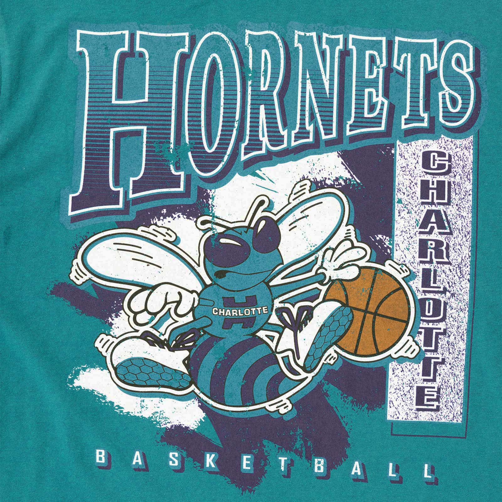 '90s style brush off print for the Charlotte Hornets. The buzz was in town with fan favourites, Alonzo, LJ and Muggsy Bogues.