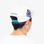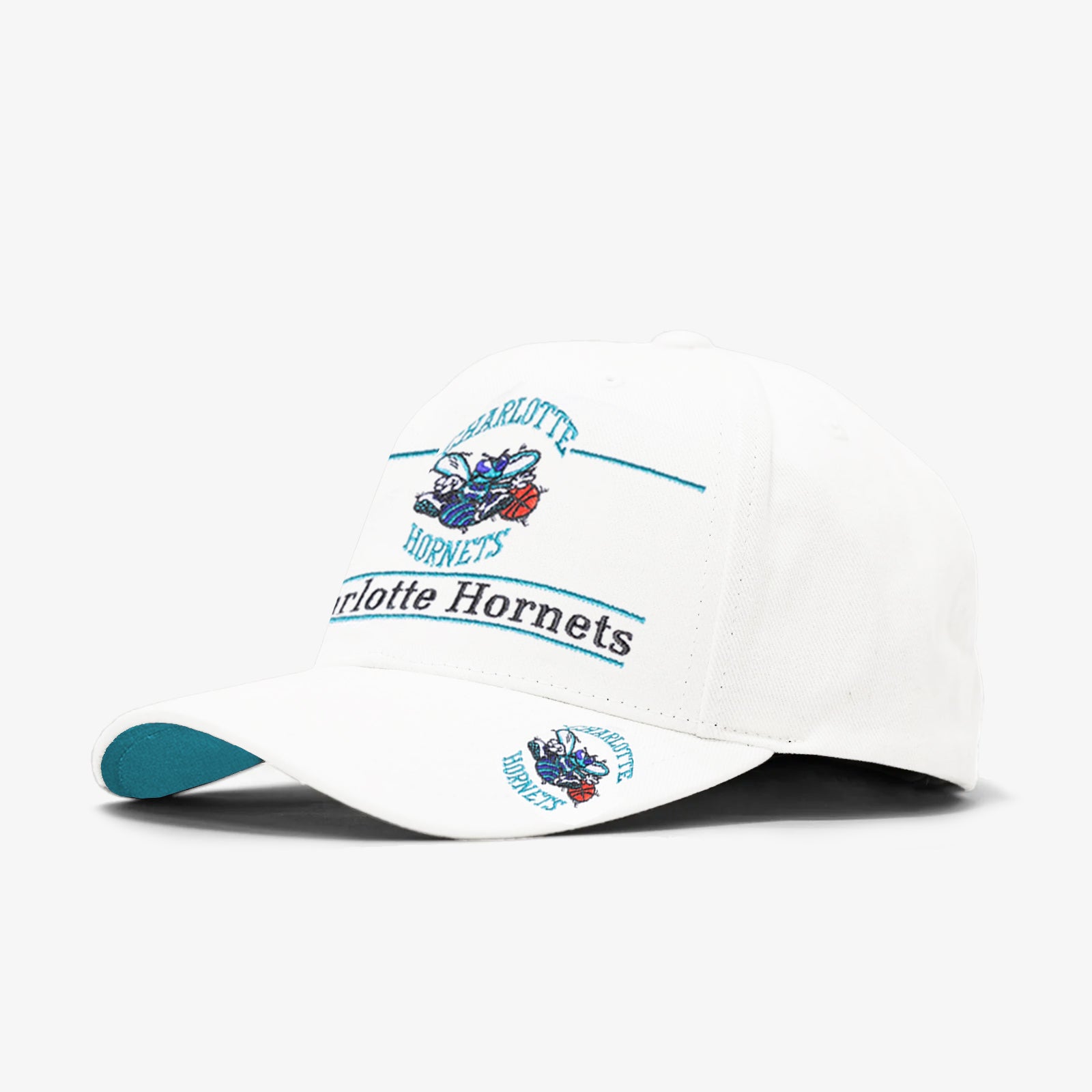 Off-white '90s styled snapback repping the Charlotte Hornets. Featuring a retro stitched side-patch honouring the franchise's 5th Anniversary.