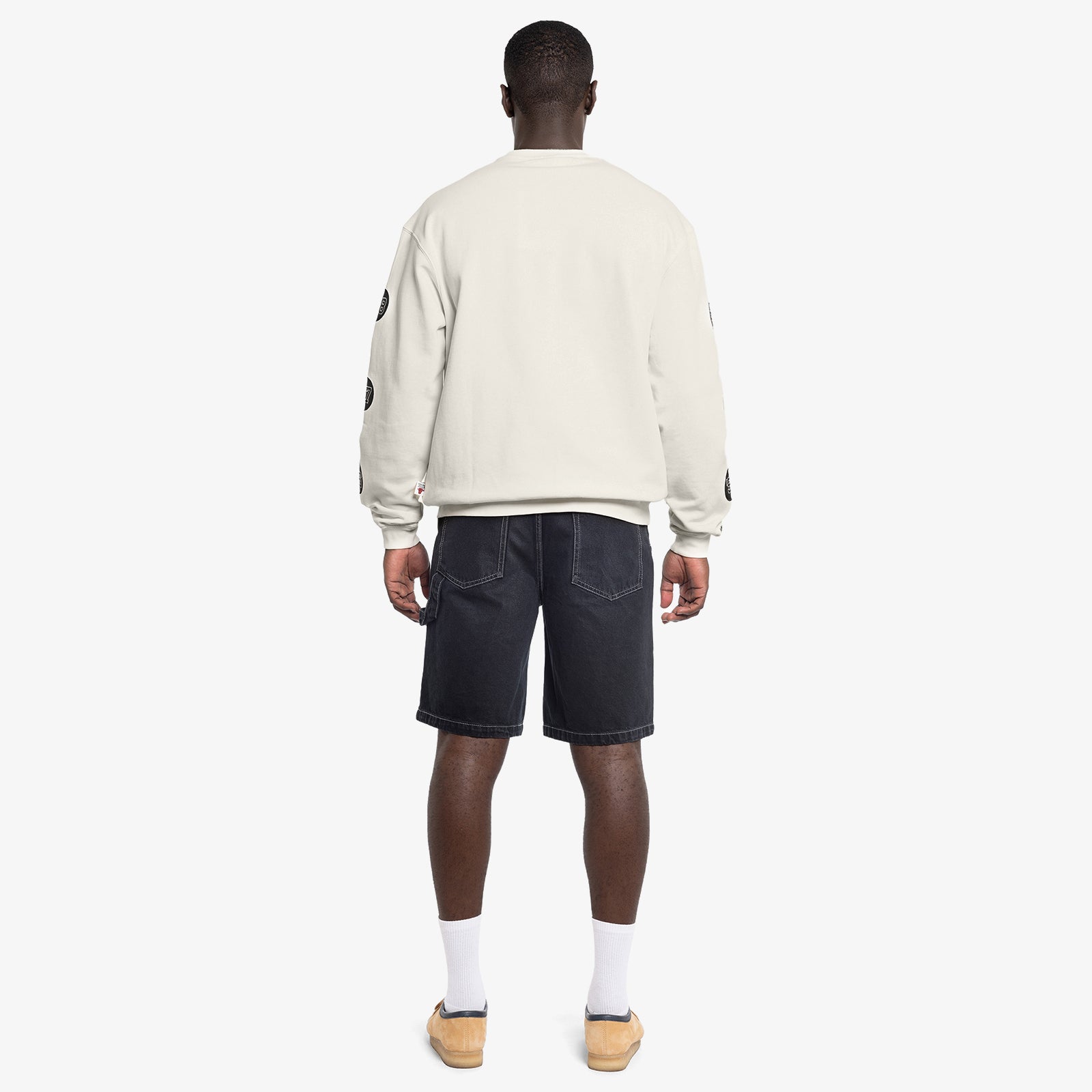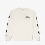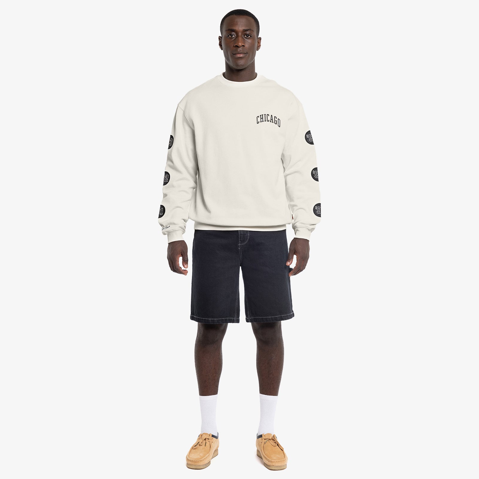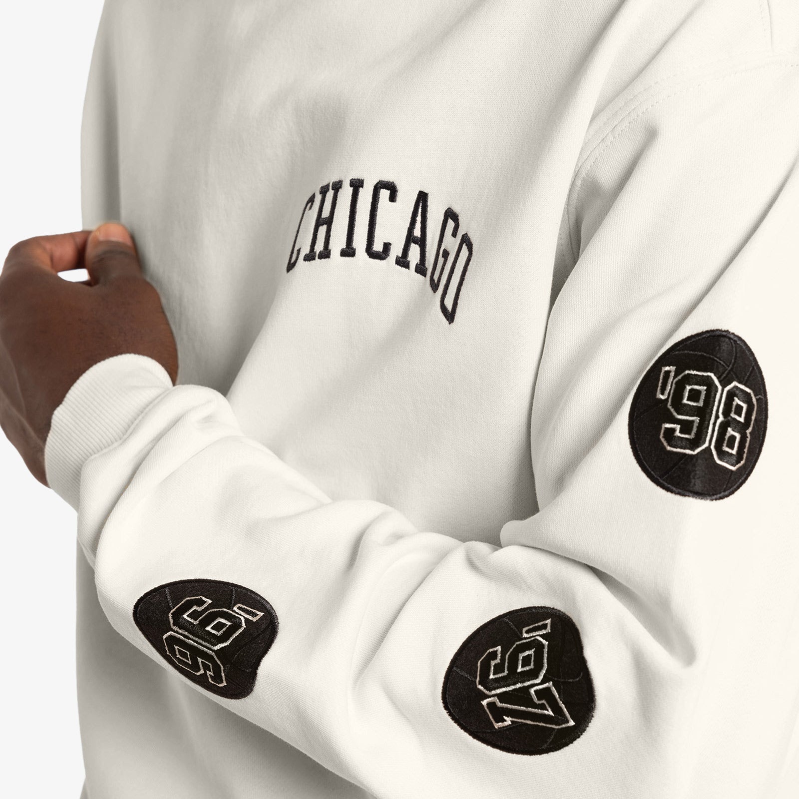 Unbleached crew sweatshirt repping 6x Champion, Chicago Bulls. The MJ era Bulls earned dual three-peats in 8 years. Each championship season commemorated with patches on each sleeve.