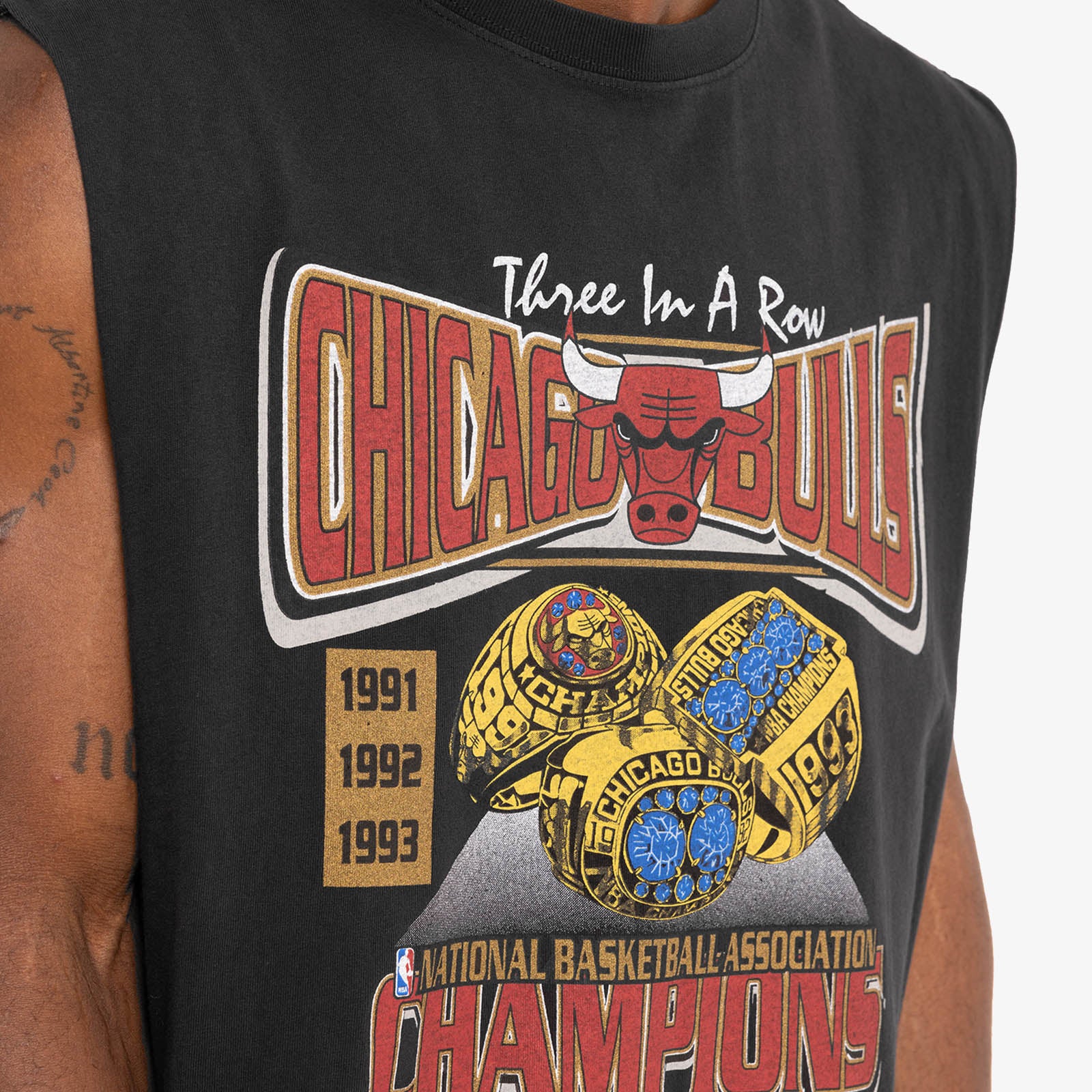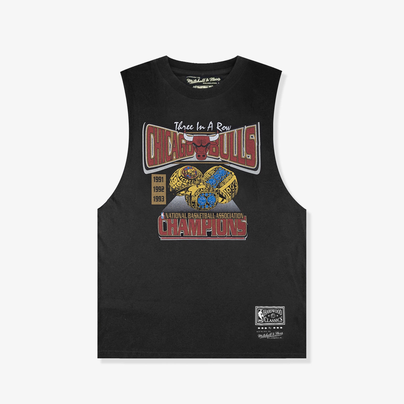 Stylised retro tee honouring the Chicago Bulls' Championship history. This celebrates the Bulls' first three-peat, winning "Three in a row" from 1991 to 1993. The team was headlined by Michael Jordan, Scottie Pippen, Horace Grant and B. J. Armstrong.