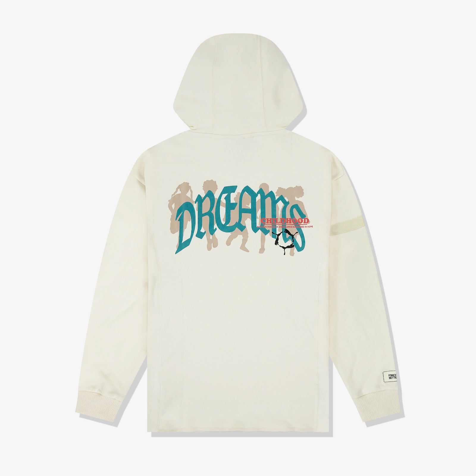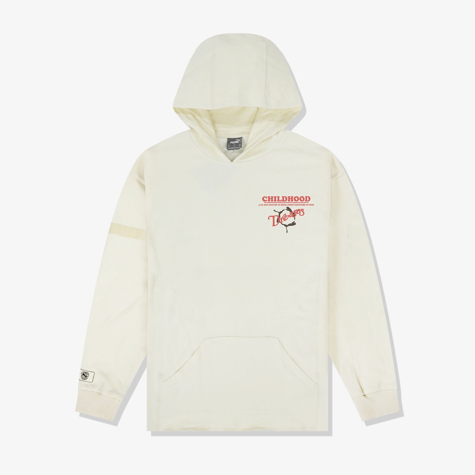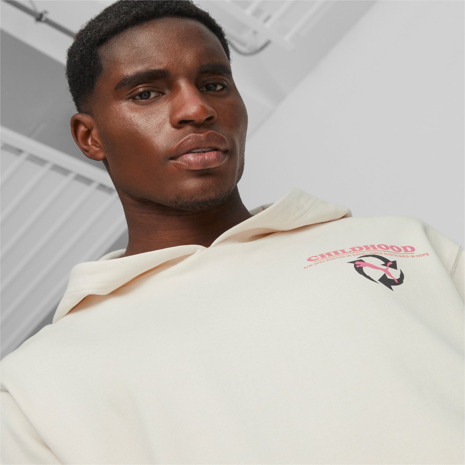 With bold, tattoo-like lettering over a rendering of children, who represent the future of a more sustainable world, the Childhood Dreams Hoodie makes a stylish and sustainable statement from every angle with its plastic-free French terry fabric. Three curved PUMA cats create a circular emblem at the chest, while a double band arm detail and kangaroo pocket add a utilitarian twist.