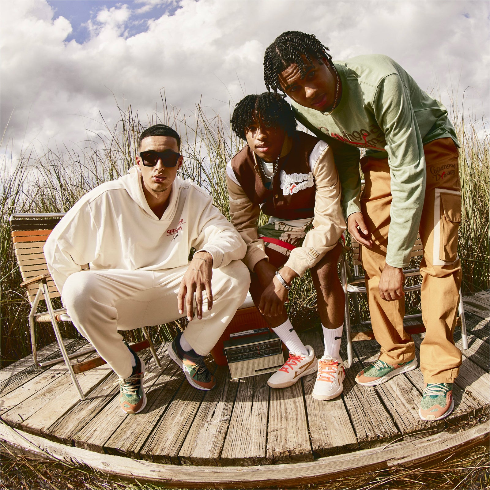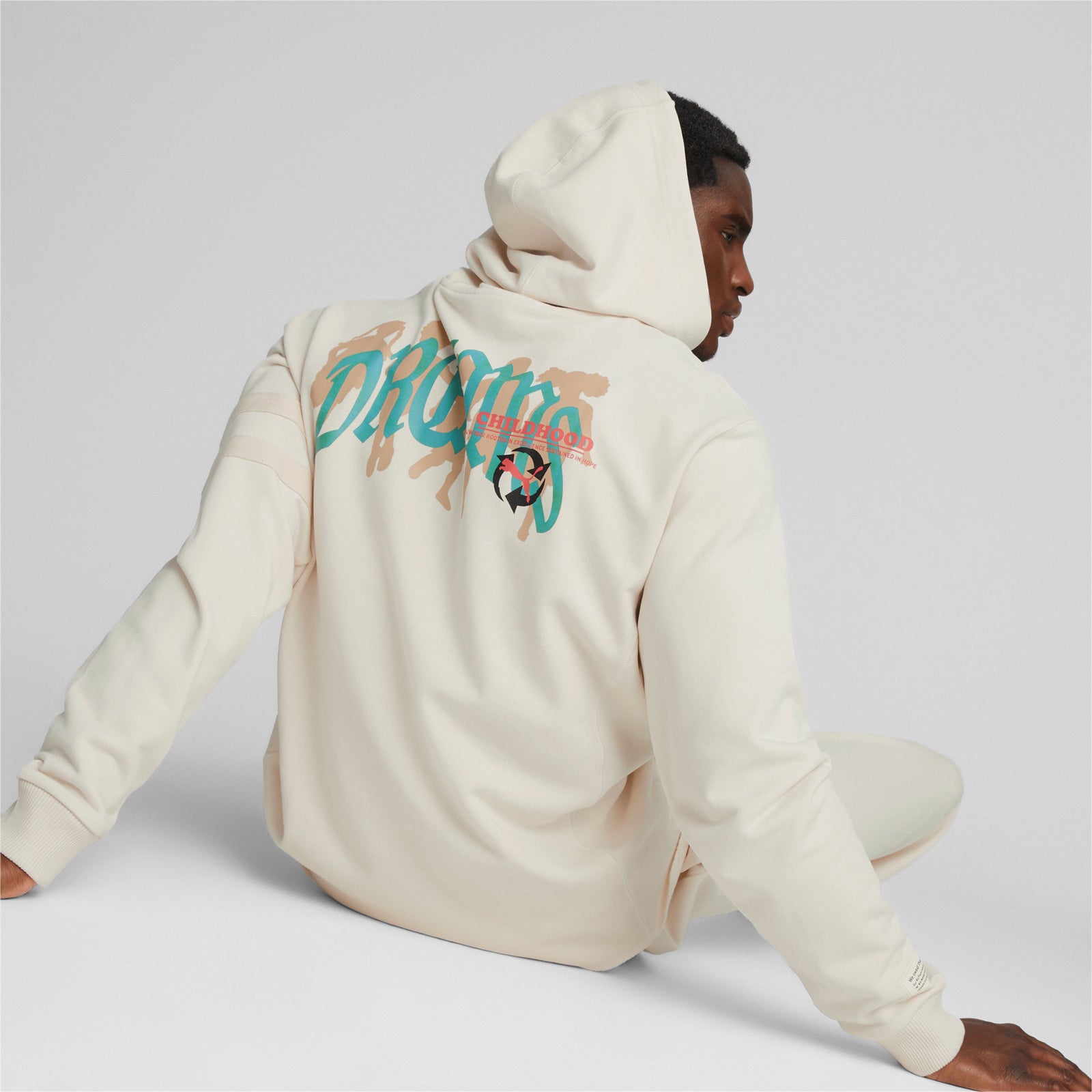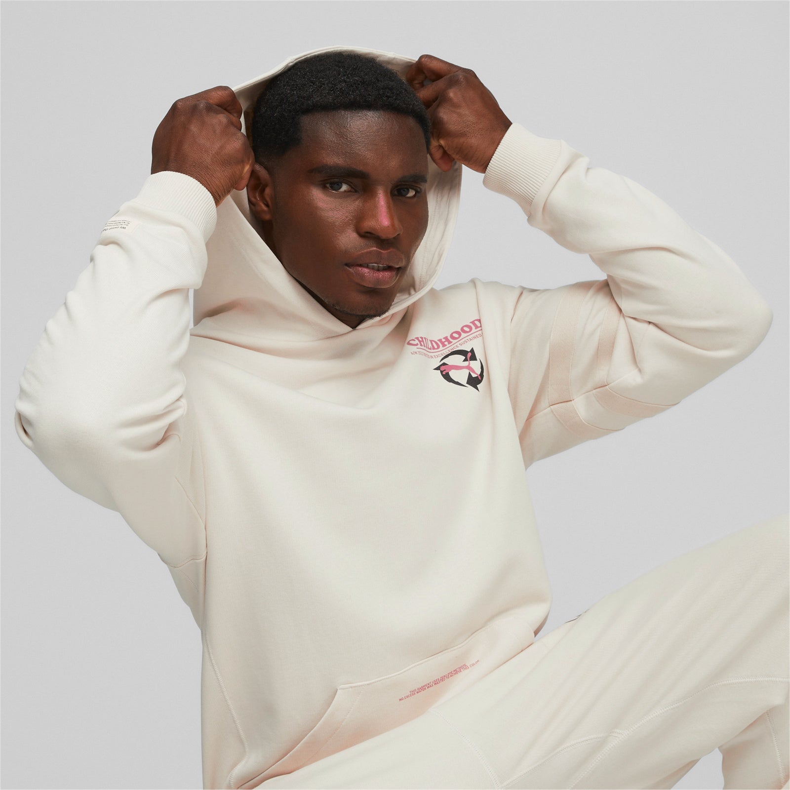 With bold, tattoo-like lettering over a rendering of children, who represent the future of a more sustainable world, the Childhood Dreams Hoodie makes a stylish and sustainable statement from every angle with its plastic-free French terry fabric. Three curved PUMA cats create a circular emblem at the chest, while a double band arm detail and kangaroo pocket add a utilitarian twist.