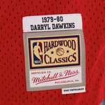 - Mitchell & Ness HWC Swingman woven jock tag and woven label 1979-80 DARRYL DAWKINS at lower left front.