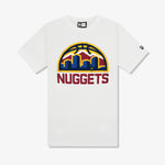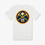 White 2022-23 City Edition T-Shirt for the Denver Nuggets. The city name of DENVER is arched across the front in blue with yellow and red trim and feature's the team’s secondary “skyline” logo.