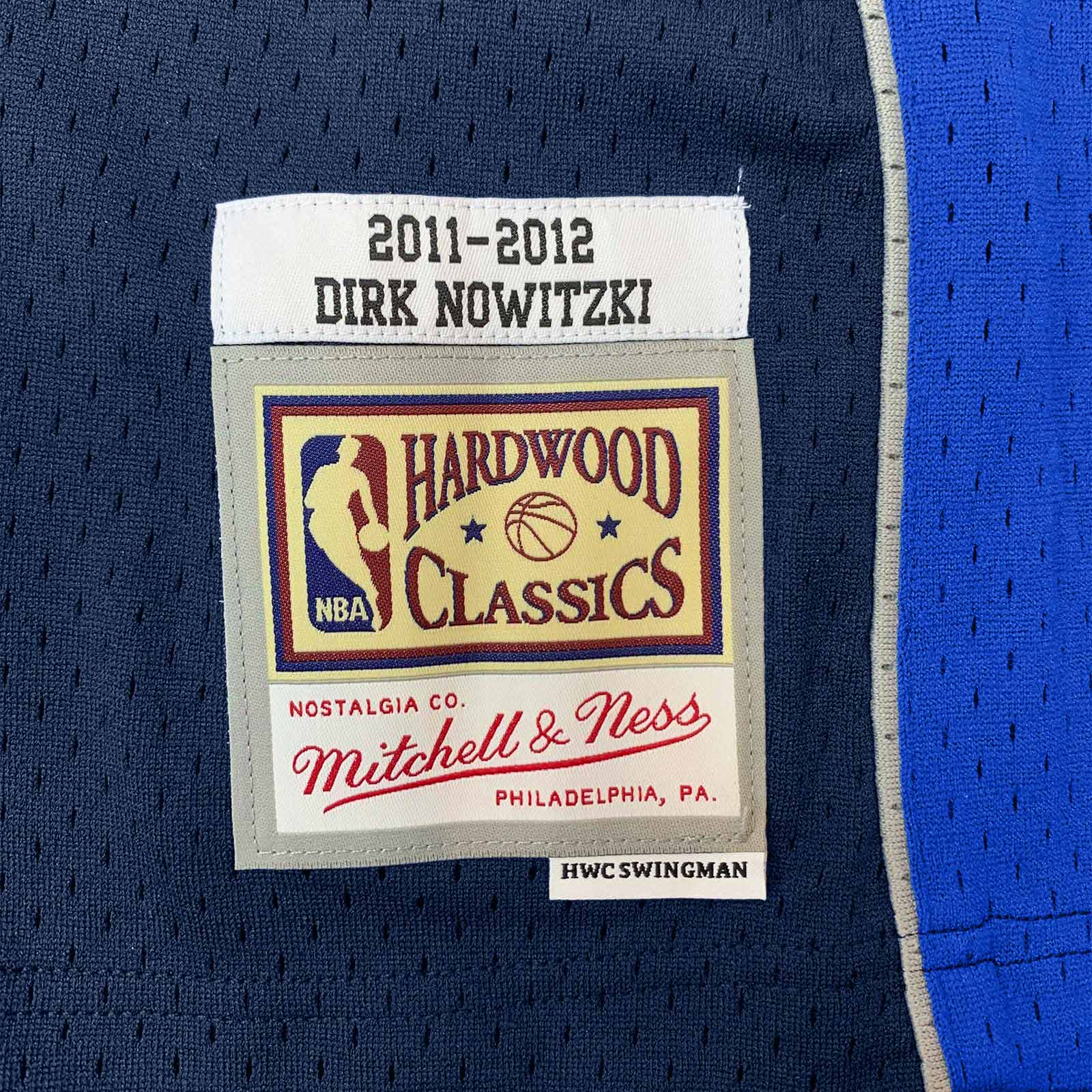 - Mitchell & Ness HWC Swingman woven jock tag and woven label 2011-12 DIRK NOWITZKI at lower left front.