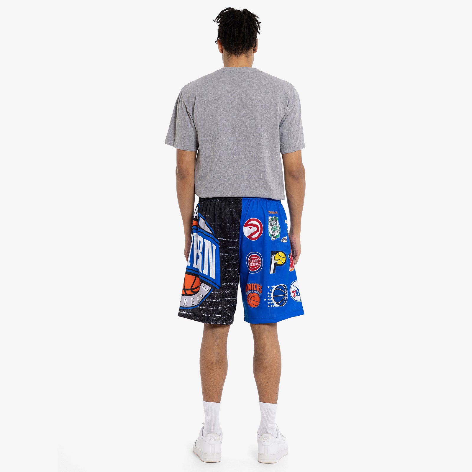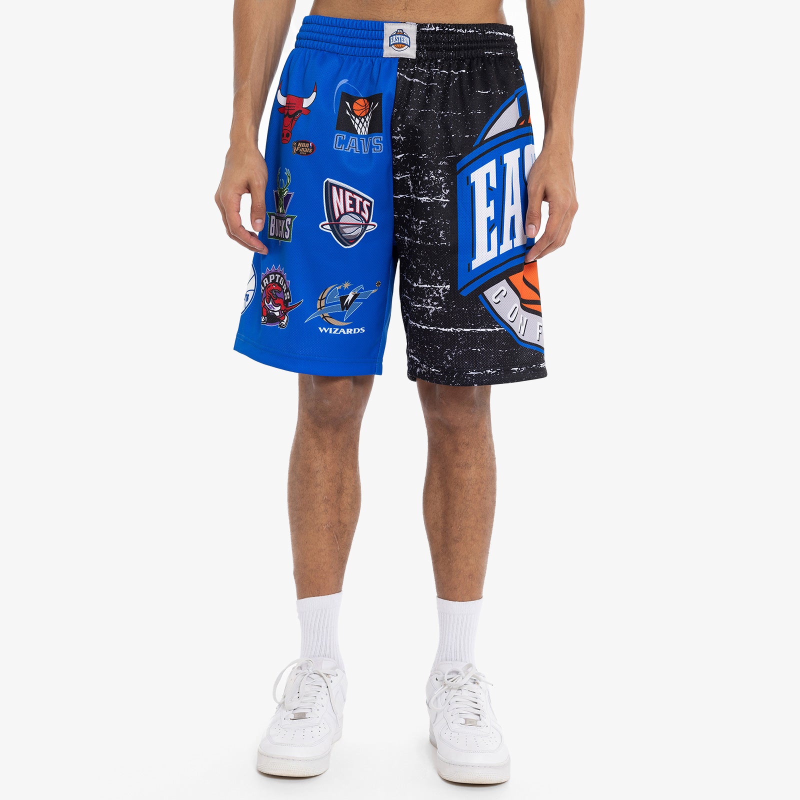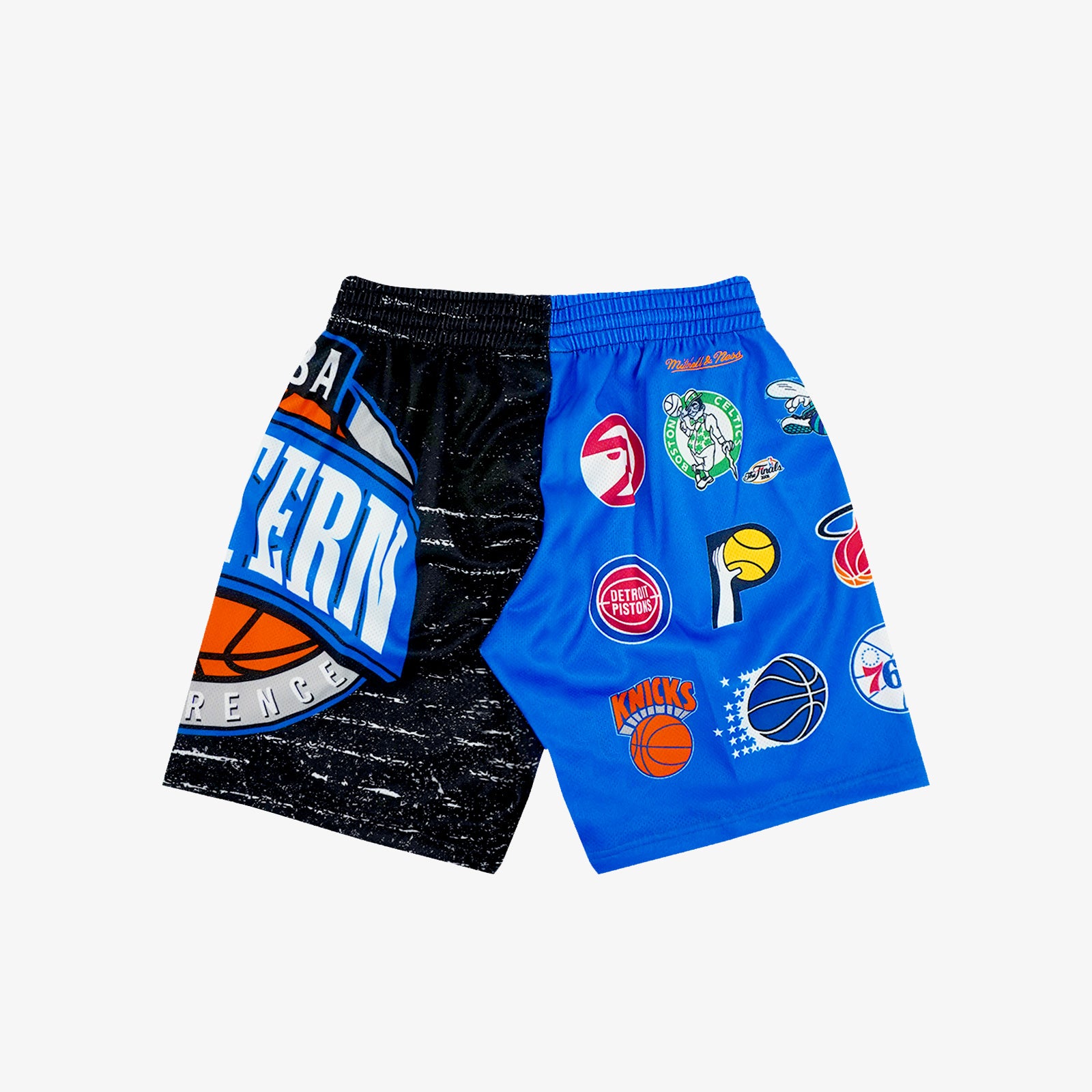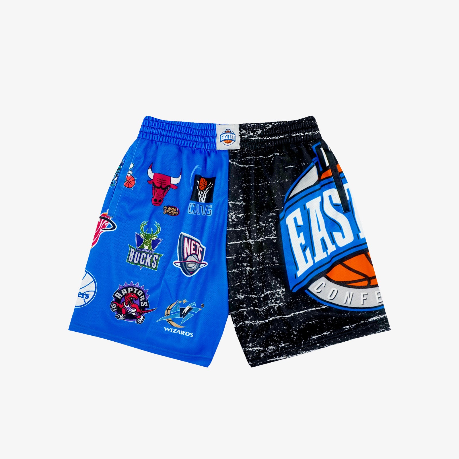Half and half large print shorts repping the Eastern Conference of the '90s. Featuring vintages logos from the era including the now defunct New Jersey Nets.