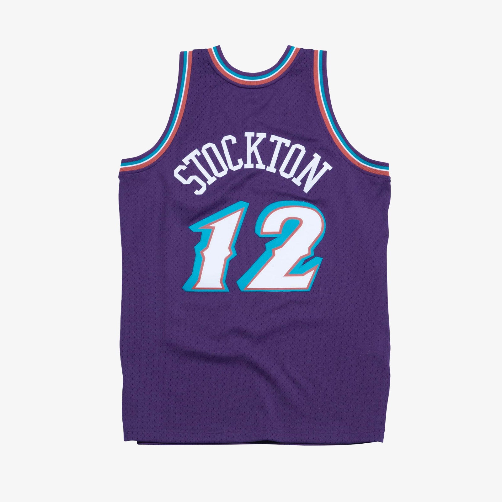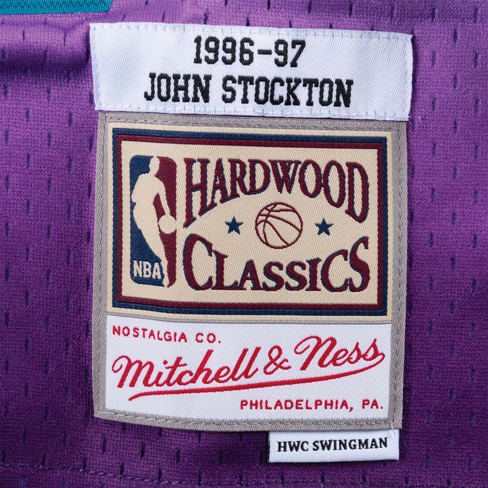 - Mitchell & Ness HWC Swingman woven jock tag and woven label 1996-97 JOHN STOCKTON at lower left front.