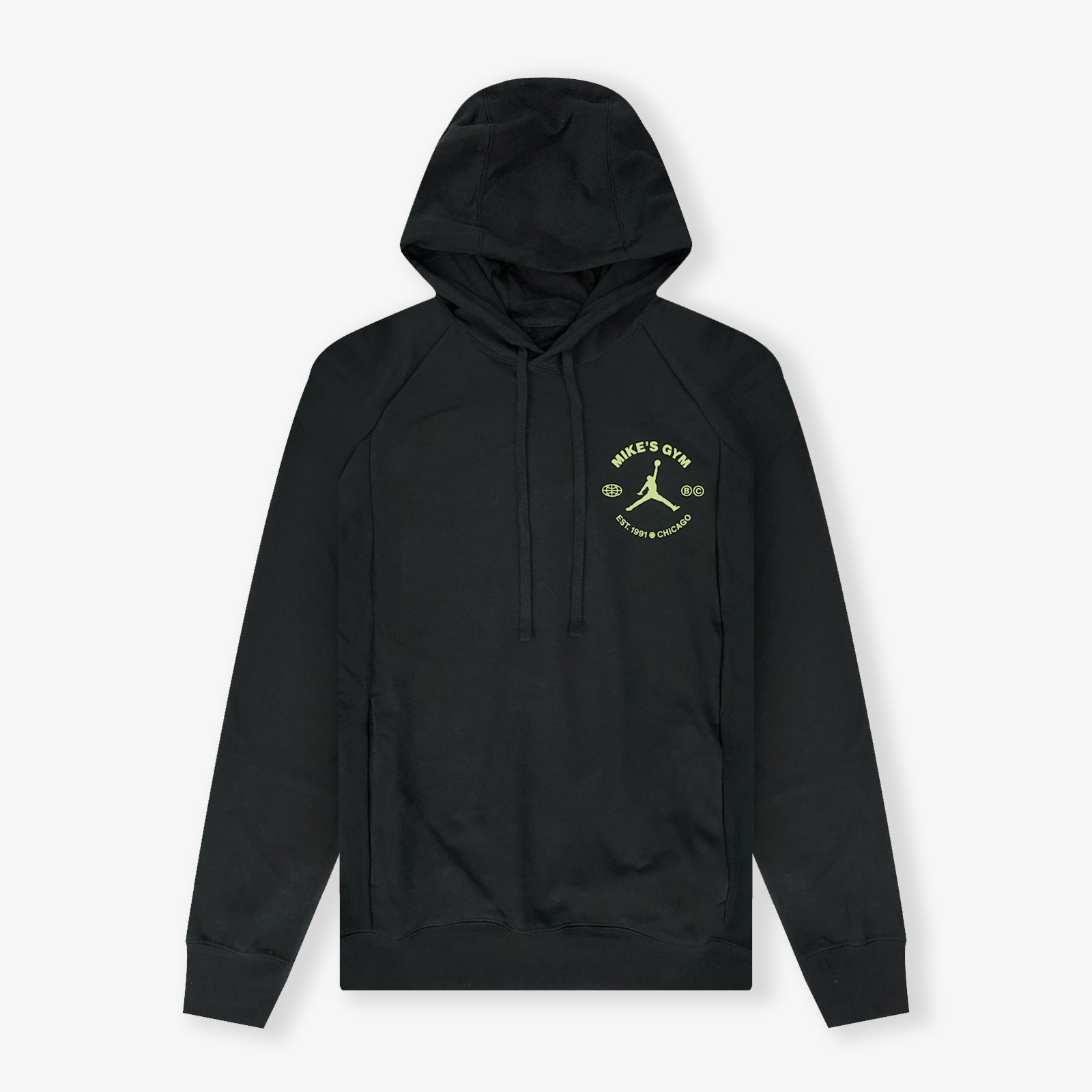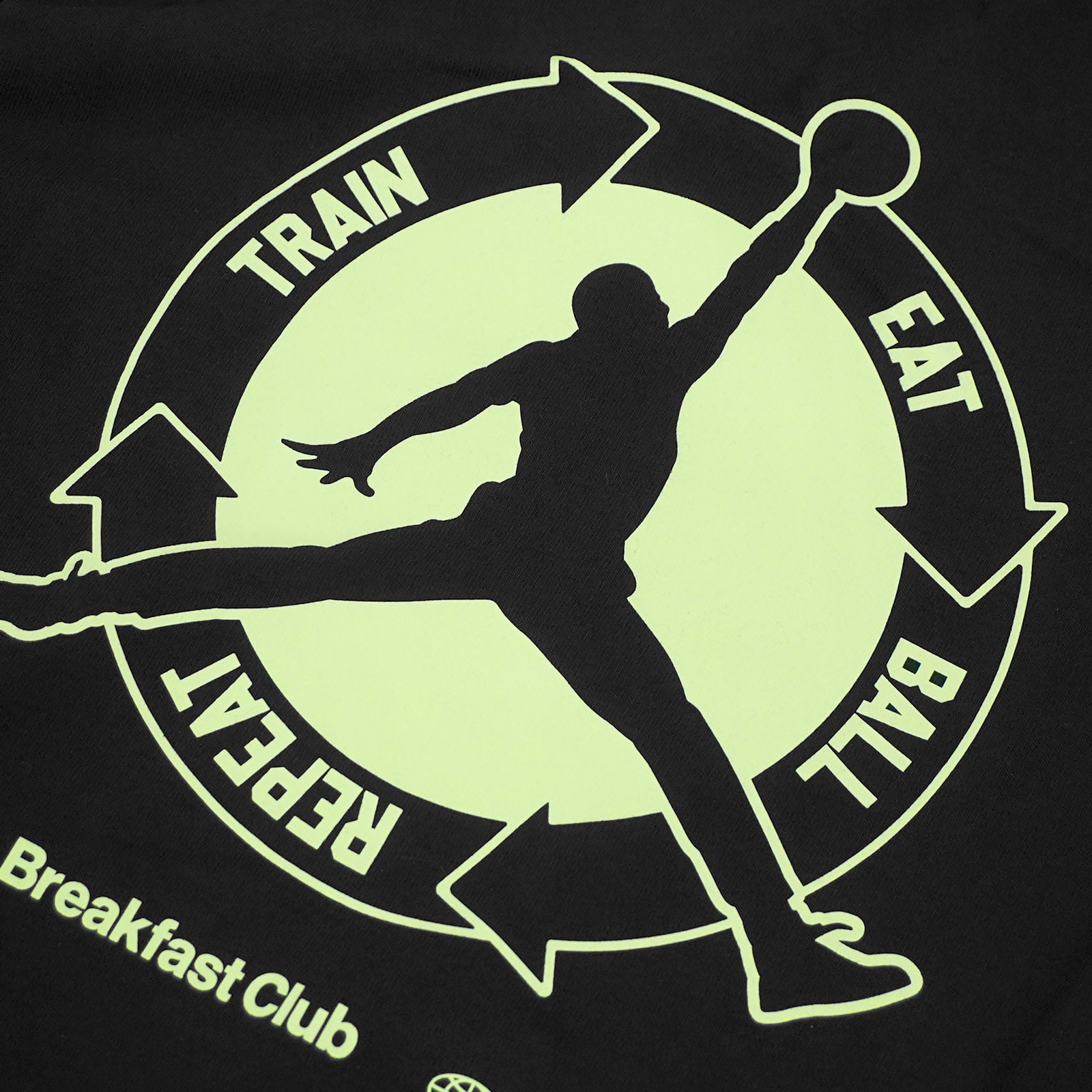 "Train >> Eat >> Ball >> Repeat". Winning two 3-peats from 1991, embody the spirit of Jordan's famed "Breakfast Club" with this black workout hoodie.