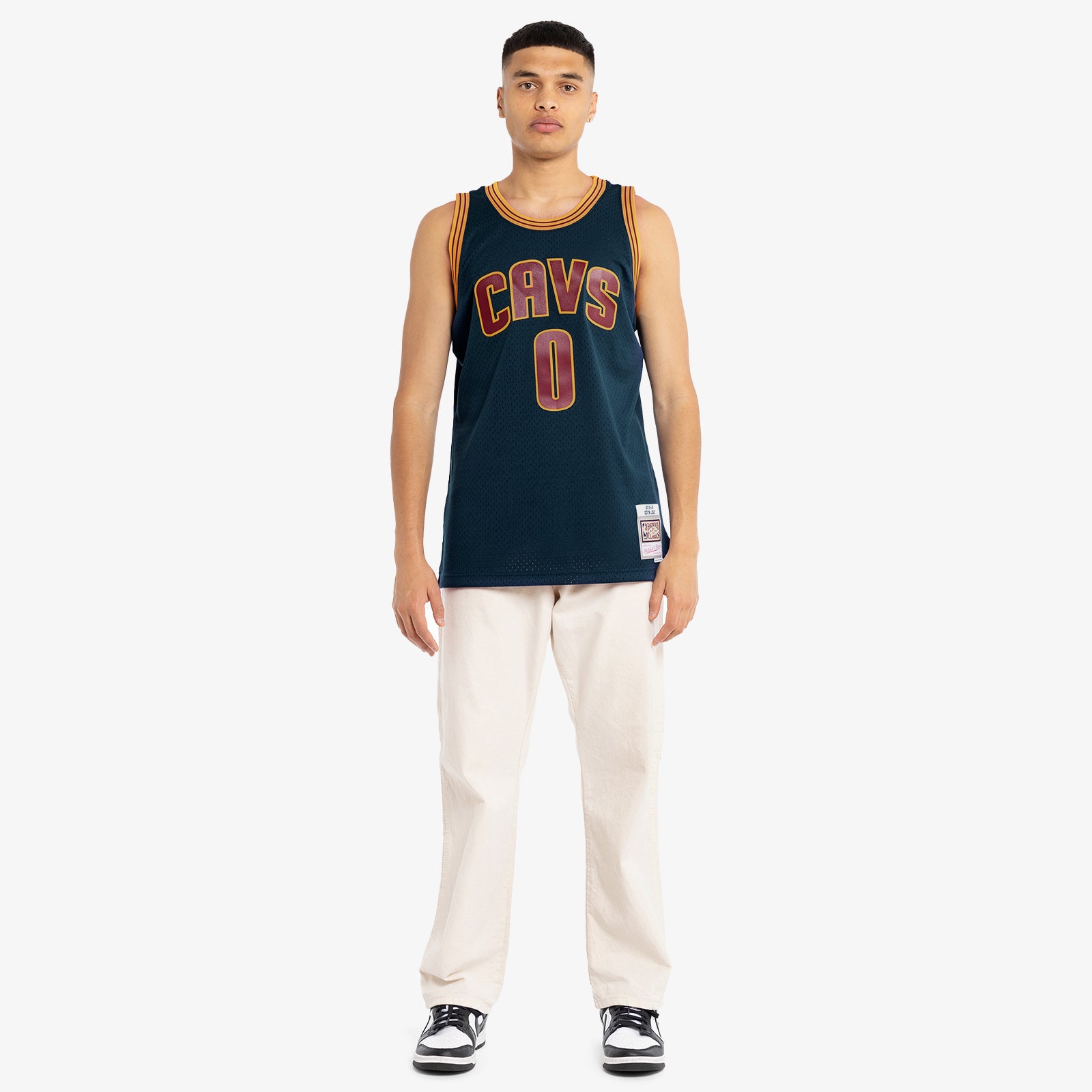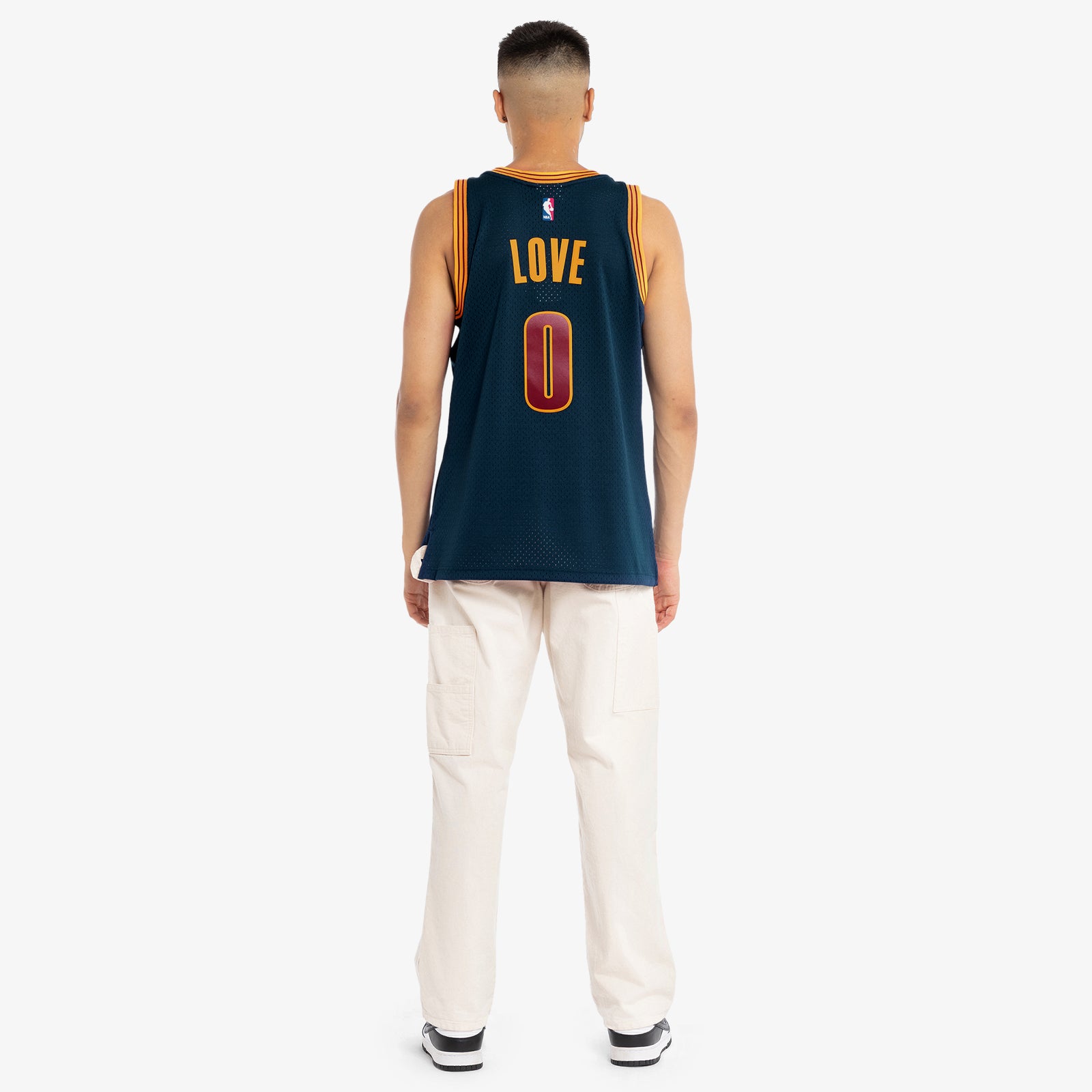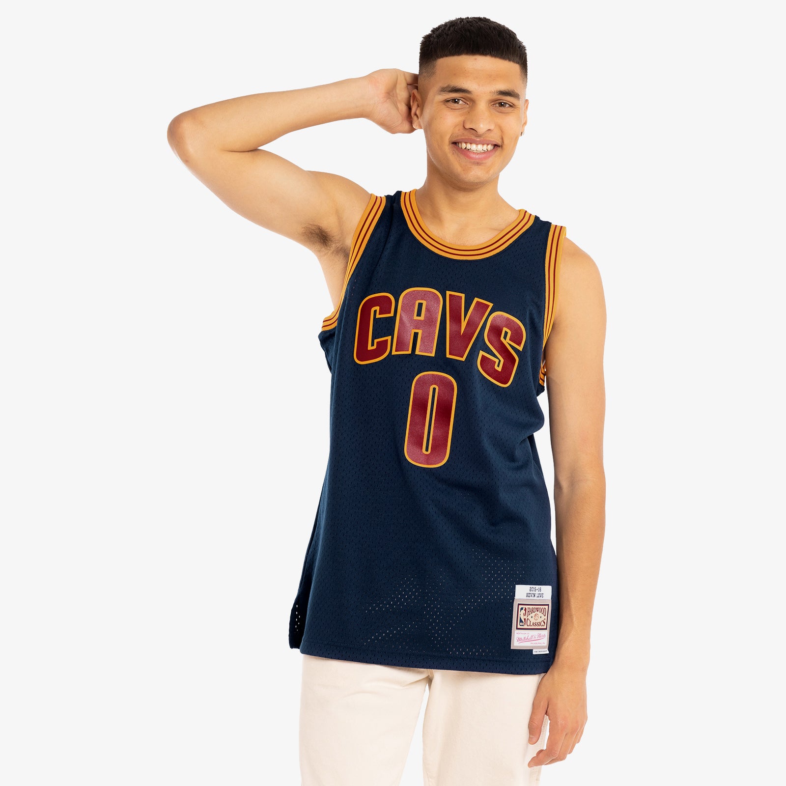 - Mitchell & Ness HWC Swingman woven jock tag and woven label 2015-16 KEVIN LOVE at lower left front.