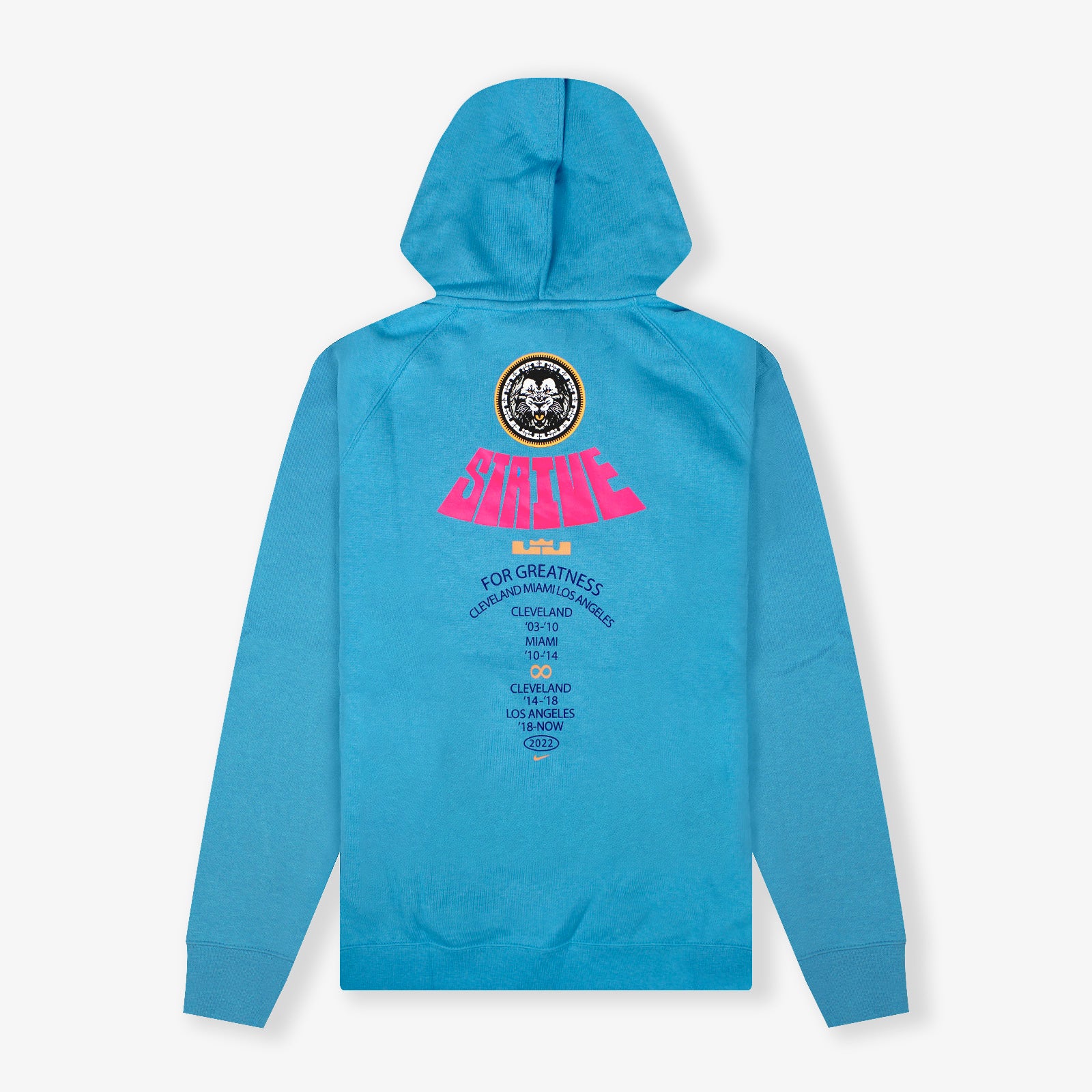 Blue hoodie with stylised LeBron XX logo in celebration of his 20th NBA season and signature sneaker with Nike. The back has a "tour dates" style graphic honouring the 3 NBA teams LeBron has played and delivered Championships for: Cleveland, Miami and Los Angeles.