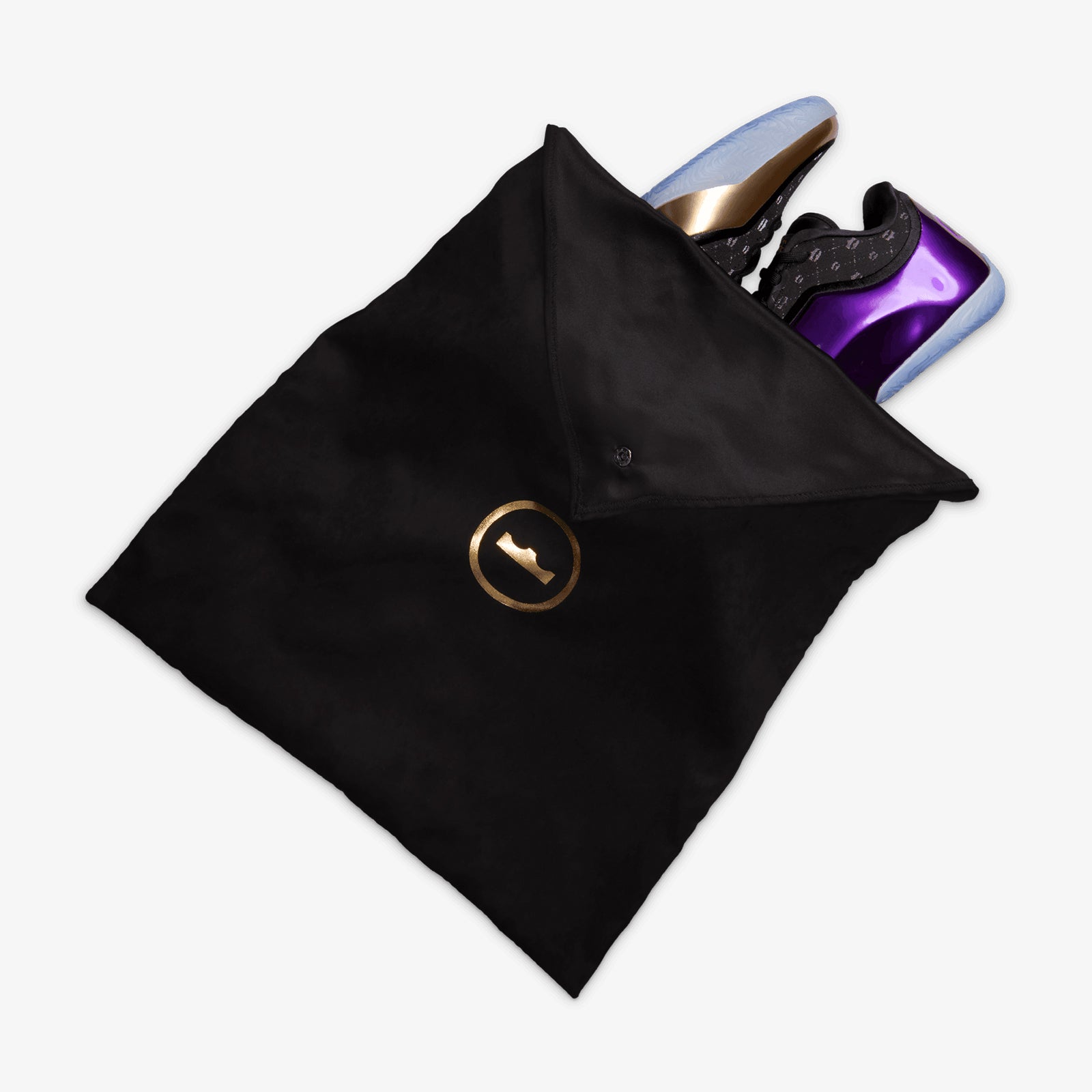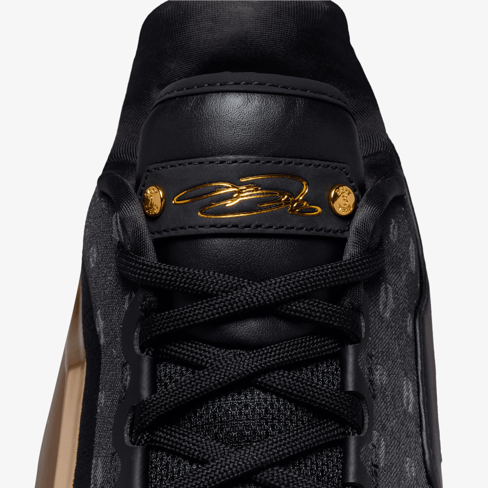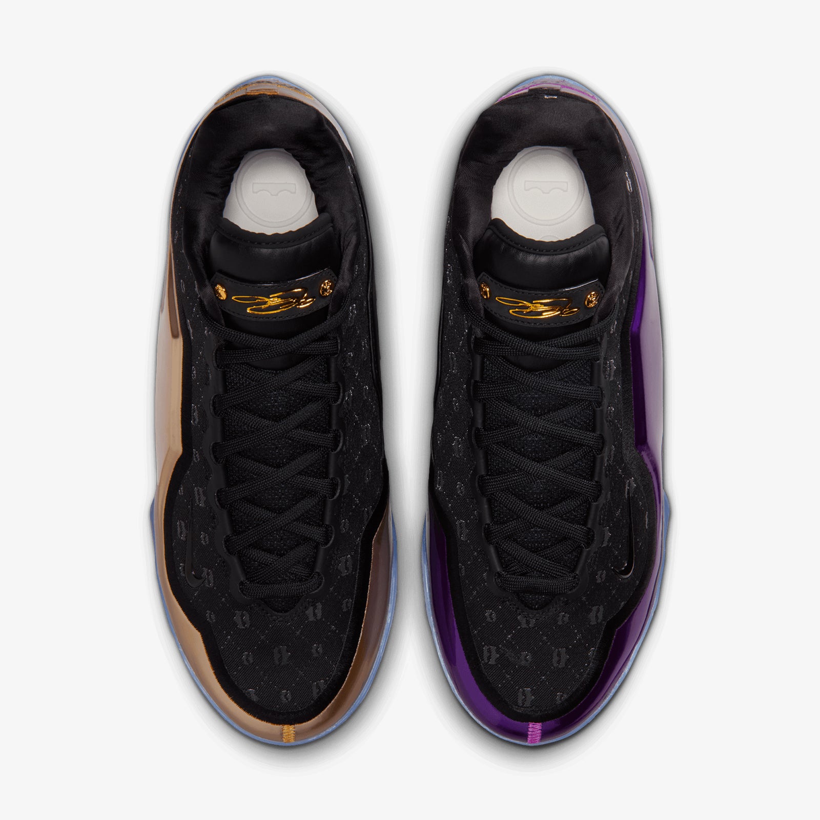 The right shoe is all about LeBron, complete with his signature gold, as well as his "Chosen 1" icon on the heel, a nod to his storied career. The black-and-purple left shoe honours Bronny with his own "1 Who Chose" heel decal, symbolising his individual path in the game. The upper pattern on both shoes is a mix of large crowns (saluting LeBron's long-standing reign) and small crowns (signifying Bronny's promise).