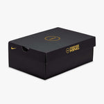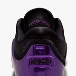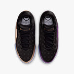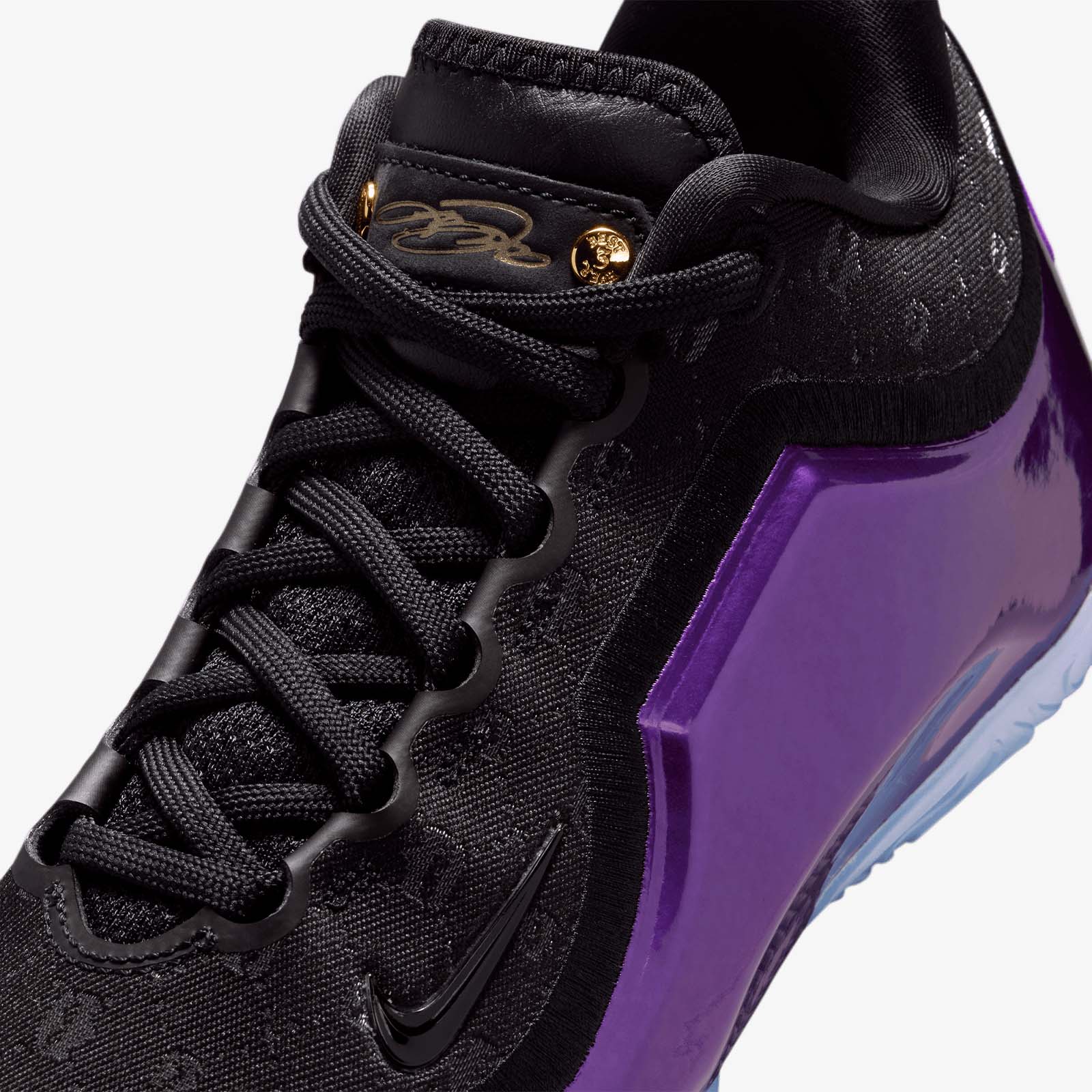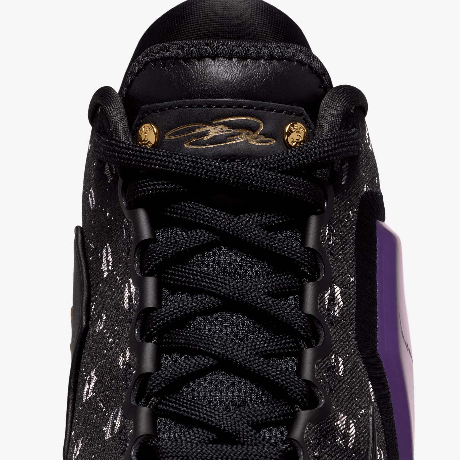 This asymmetrical pairing celebrates when LeBron and Bronny checked into the Lakers’ season opener together on October 24, 2024, marking a historic father-son debut on the court. The right shoe is all about LeBron, complete with his signature gold, as well as his “Chosen 1” icon on the heel. The black-and-purple left shoe honors Bronny with his own "1 Who Chose" heel decal, symbolizing his individual path in the game. The upper pattern on both shoes is a mix of large crowns (saluting LeBron’s long-standing reign) and small crowns (signifying Bronny’s promise).