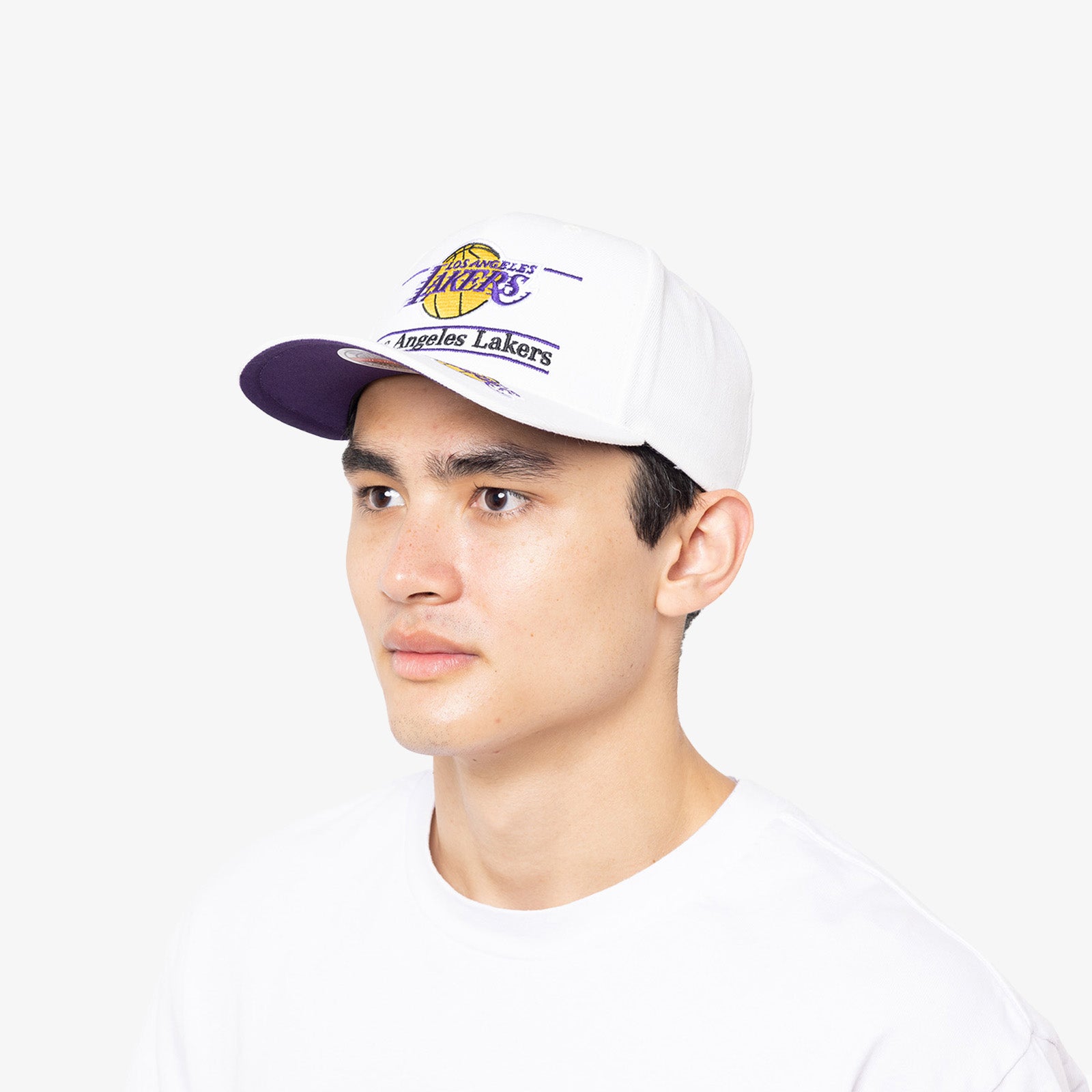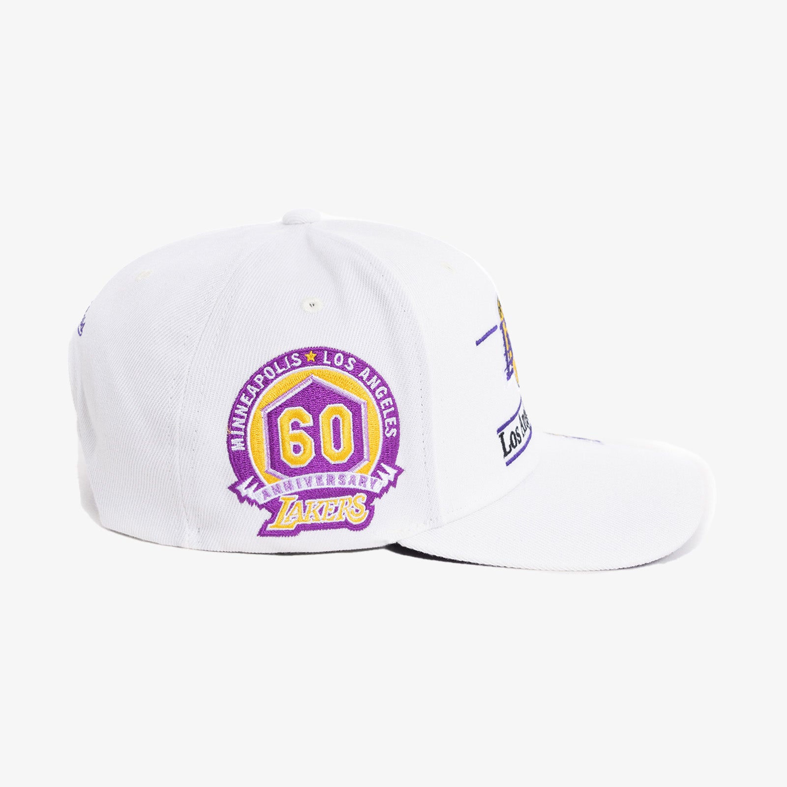 Off-white '90s styled snapback repping the Los Angeles Lakers. Featuring a retro stitched side-patch honouring the franchise's 60th Anniversary as the Minneapolis and LA Lakers.