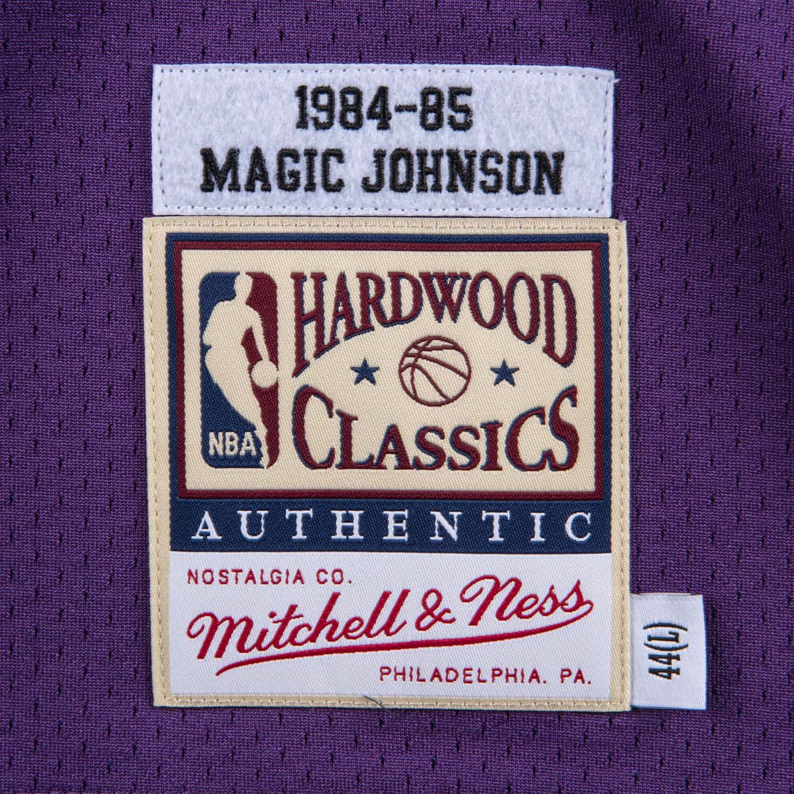 - Mitchell & Ness HWC Swingman woven jock tag and woven label 1984-85 MAGIC JOHNSON at lower left front.