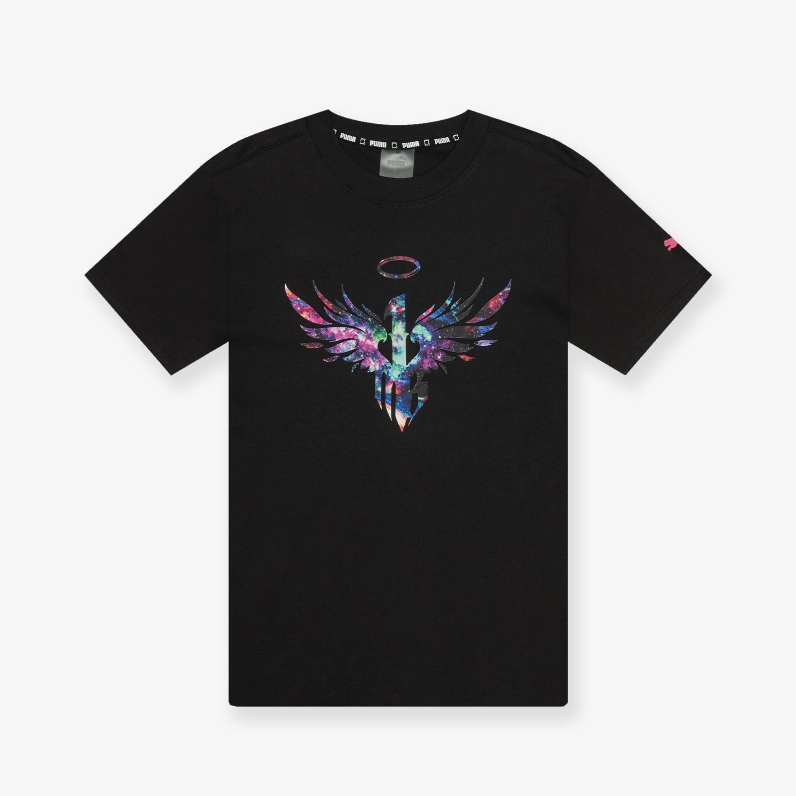 Black shirt, part of LaMelo Ball's apparel collection to go with his MB.02s. This tee has subtle print in the signature "R.A.R.E Design" aesthetic featured on a boxy fit. With the classic embroidered PUMA Cat Logo on the arm, this tee is sure to be a staple of any wardrobe.