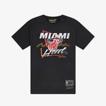 Retro graphic tee for the Miami Heat. The Heat are best known for the championship eras of Dwyane Wade partnering with Shaq then forming the Big3 with Draft classmates LeBron James and Chris Bosh.