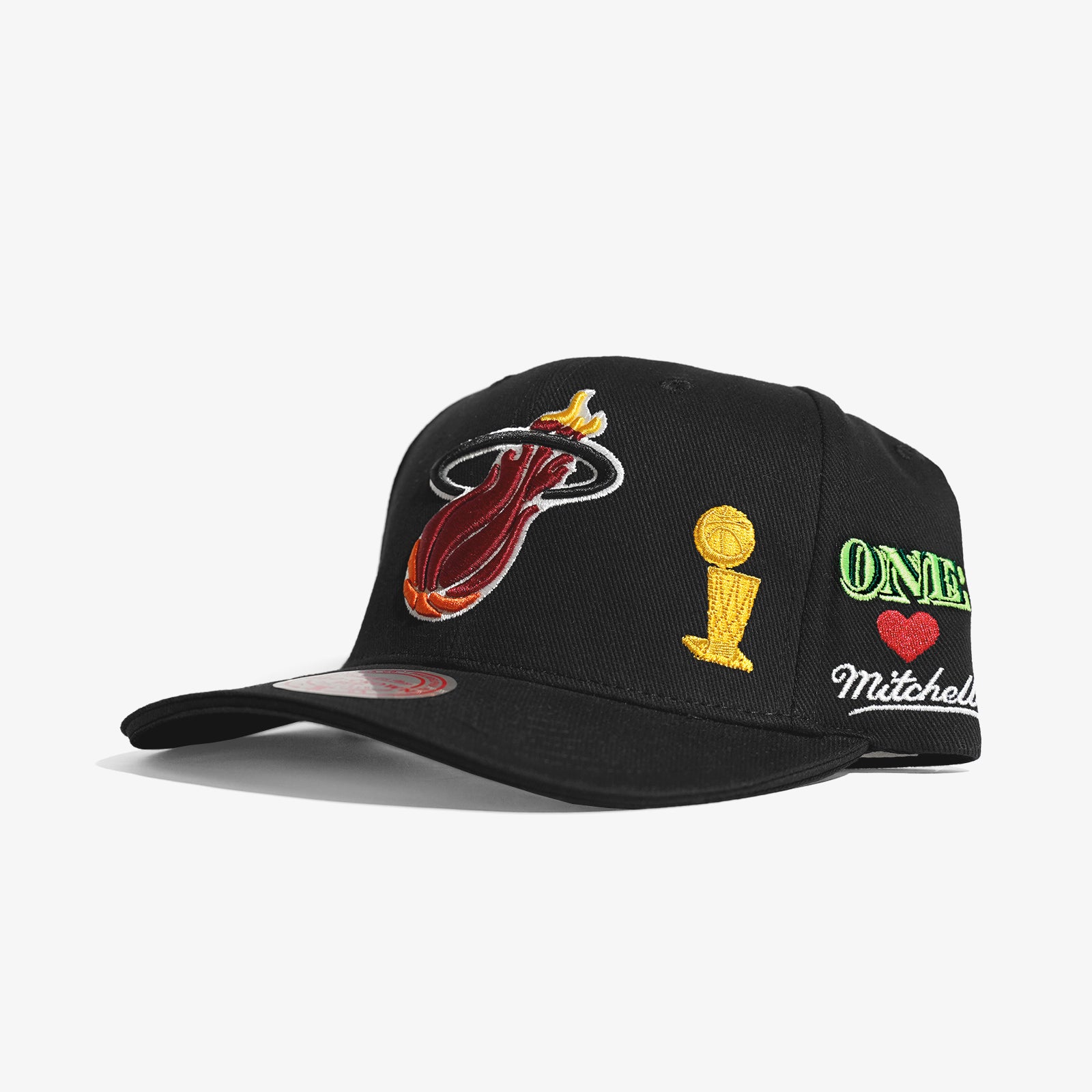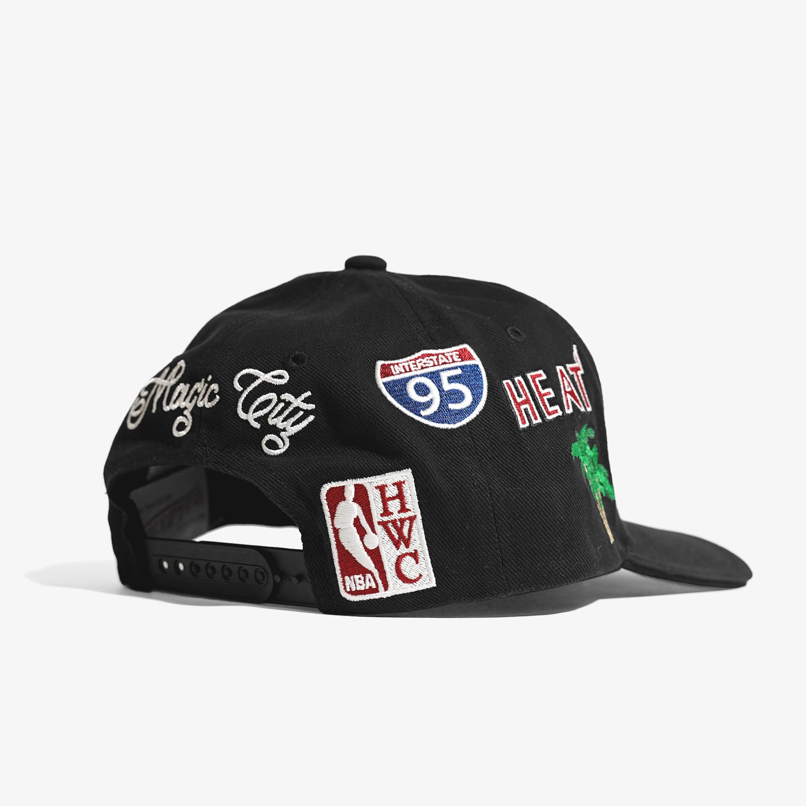 Showing love to 3x NBA champion Miami Heat. Featuring iconic elements of the city, including embroidered palm trees, the Larry OB trophy, interstate signs and a "Magic City" script on the back.