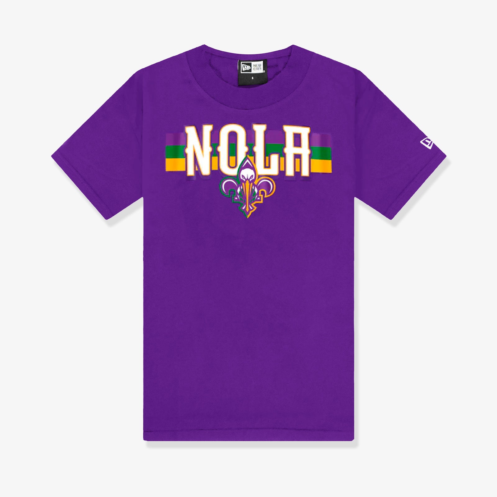 Purple 2022-23 City Edition T-Shirt for the New Orleans Pelicans. The uniform celebrates the city of New Orleans and one of the greatest shows on Earth – Mardi Gras.