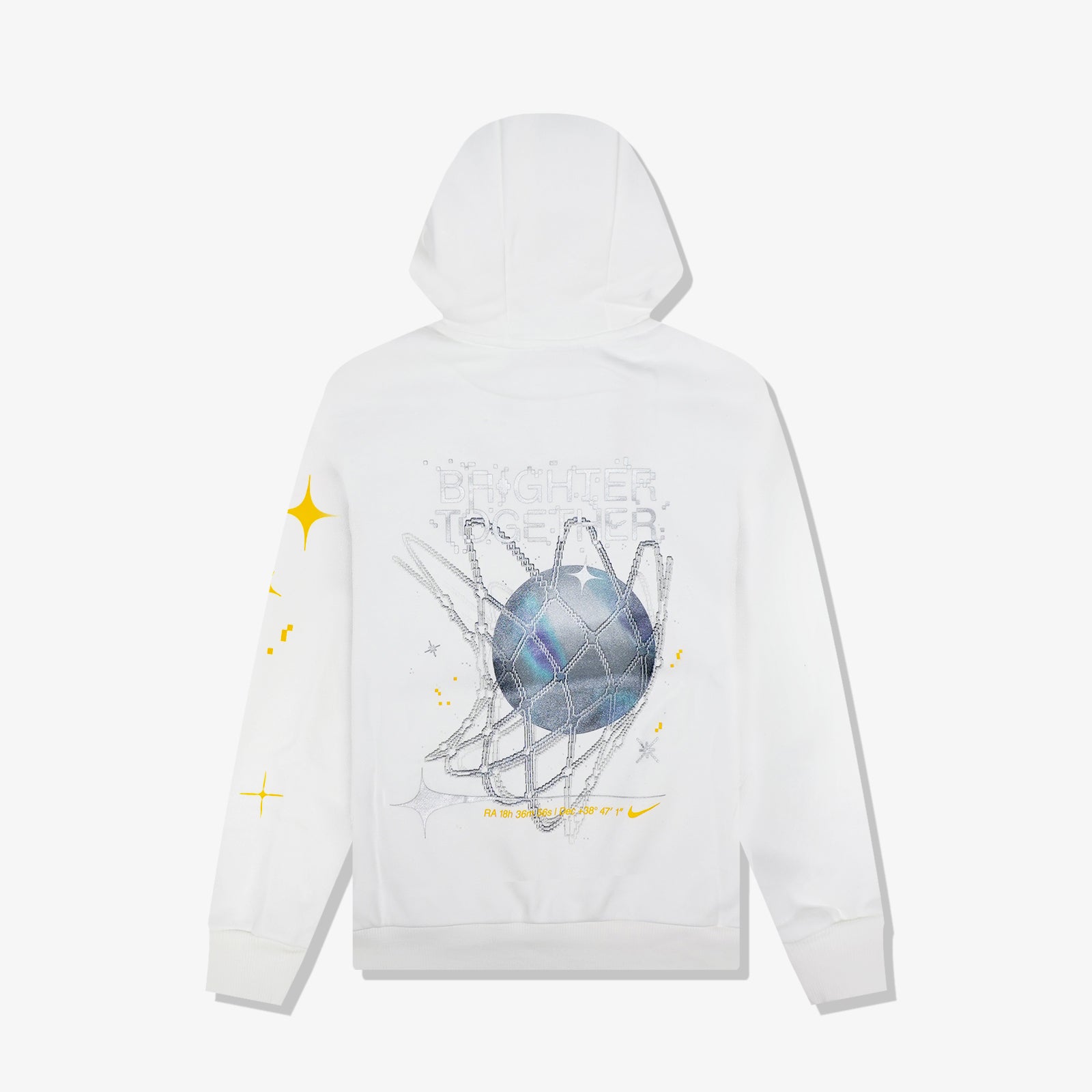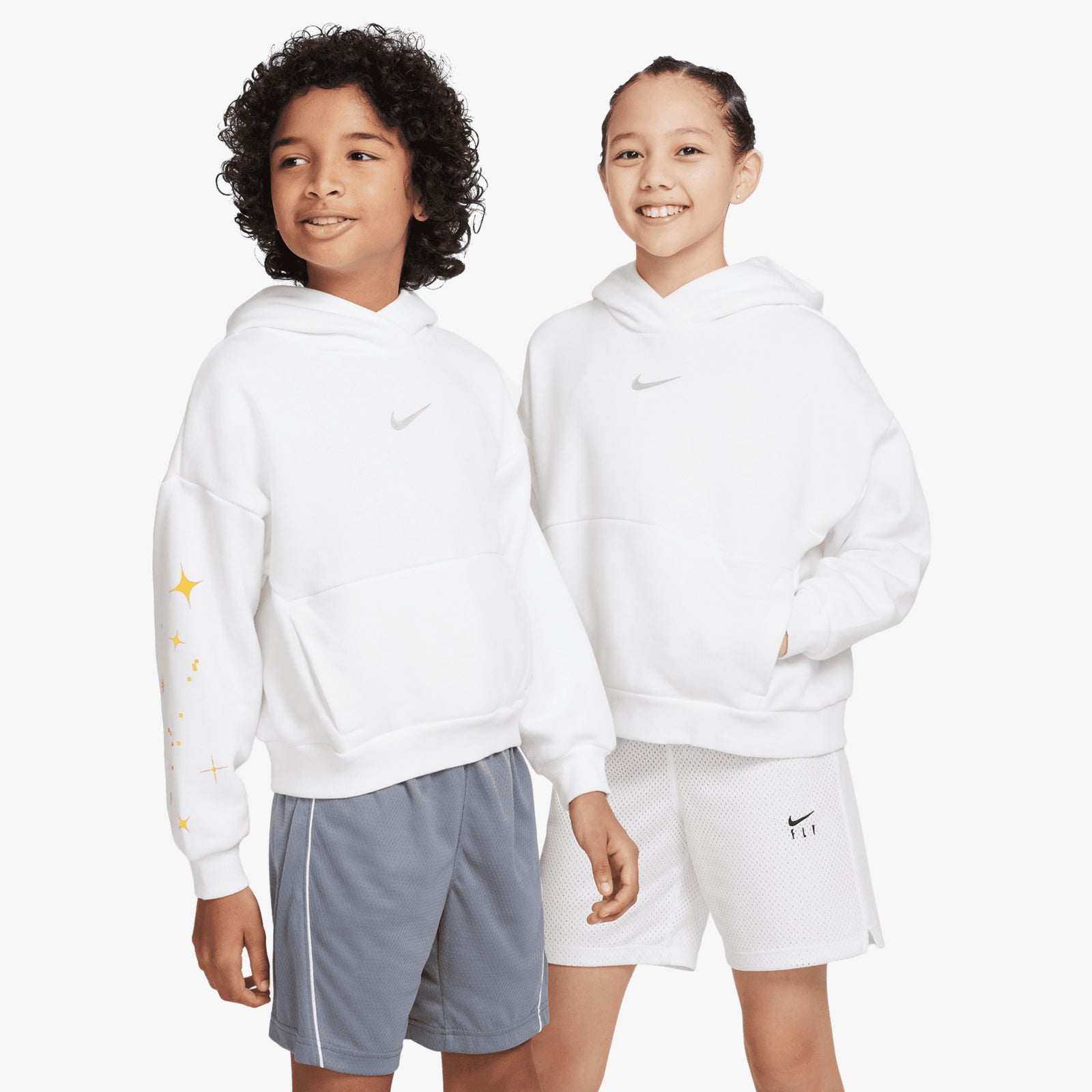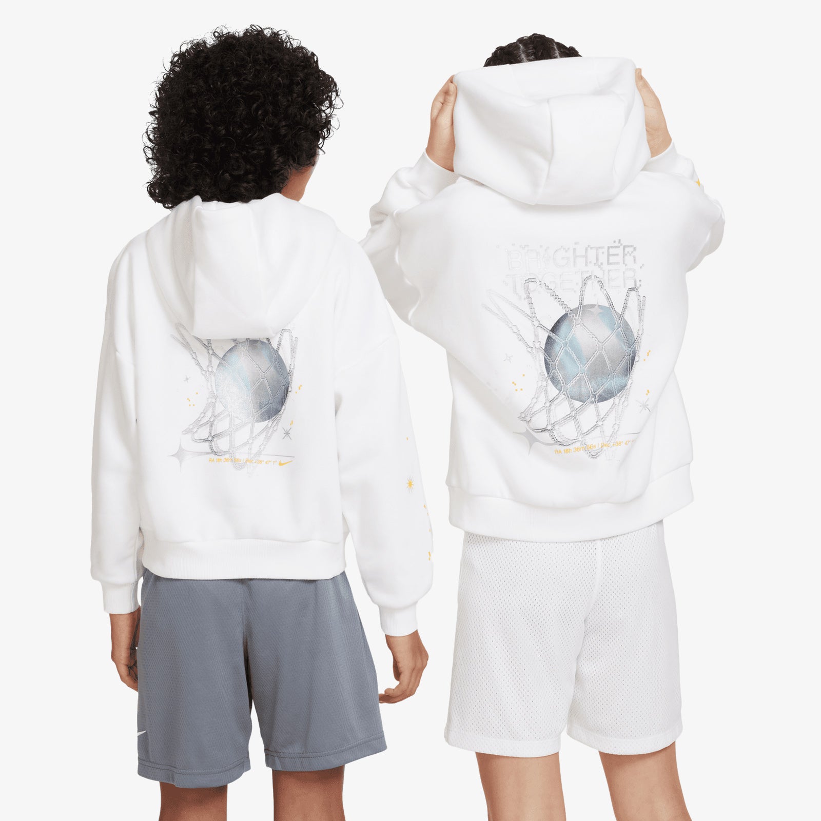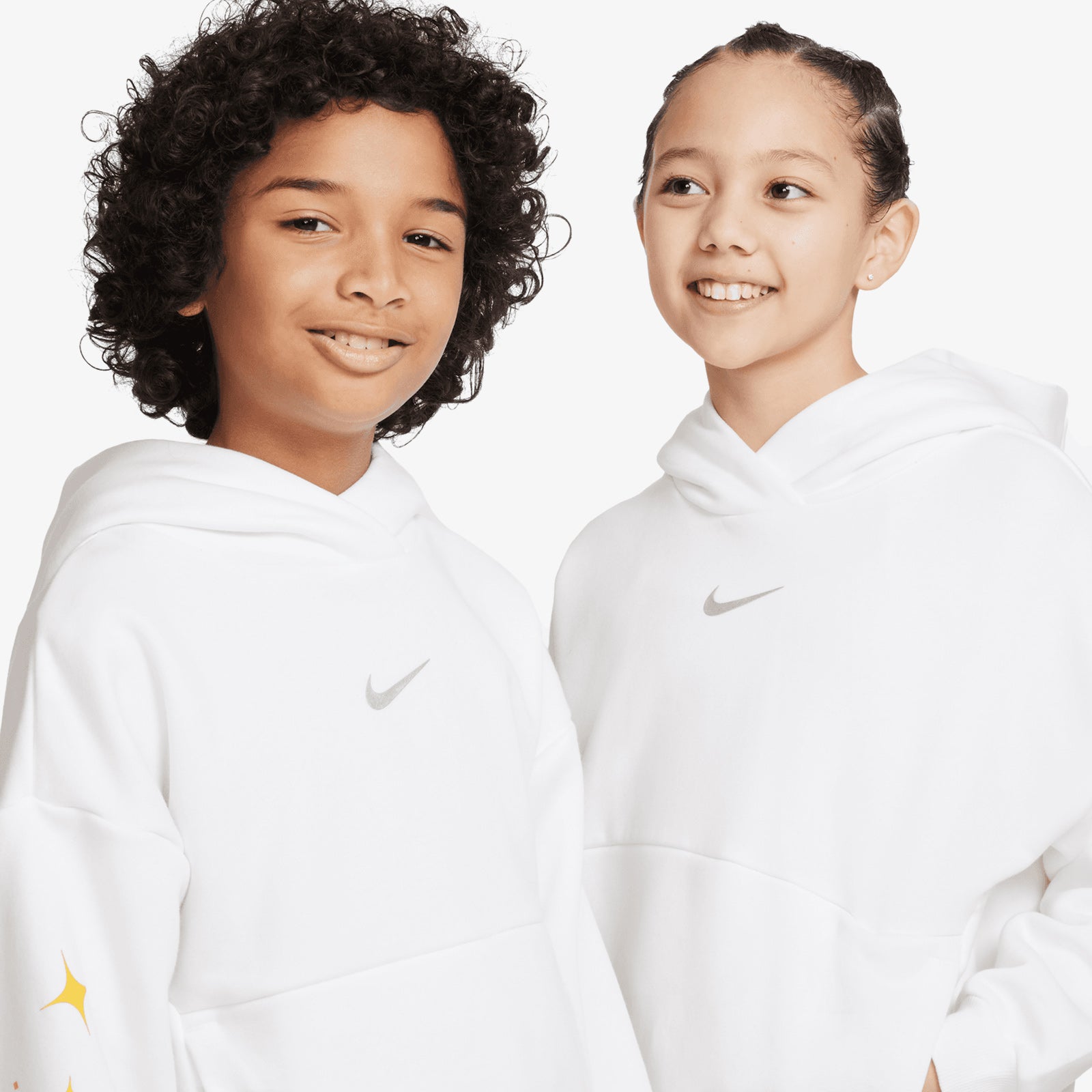 White youth hoodie for the young stars in your galaxy. Inspired by the star within everyone, the Nike Icon Fleece hoodie celebrates what you're great at. "Brighter Together" large print graphics bring extra star power to your oversized soft fleece hoodie.