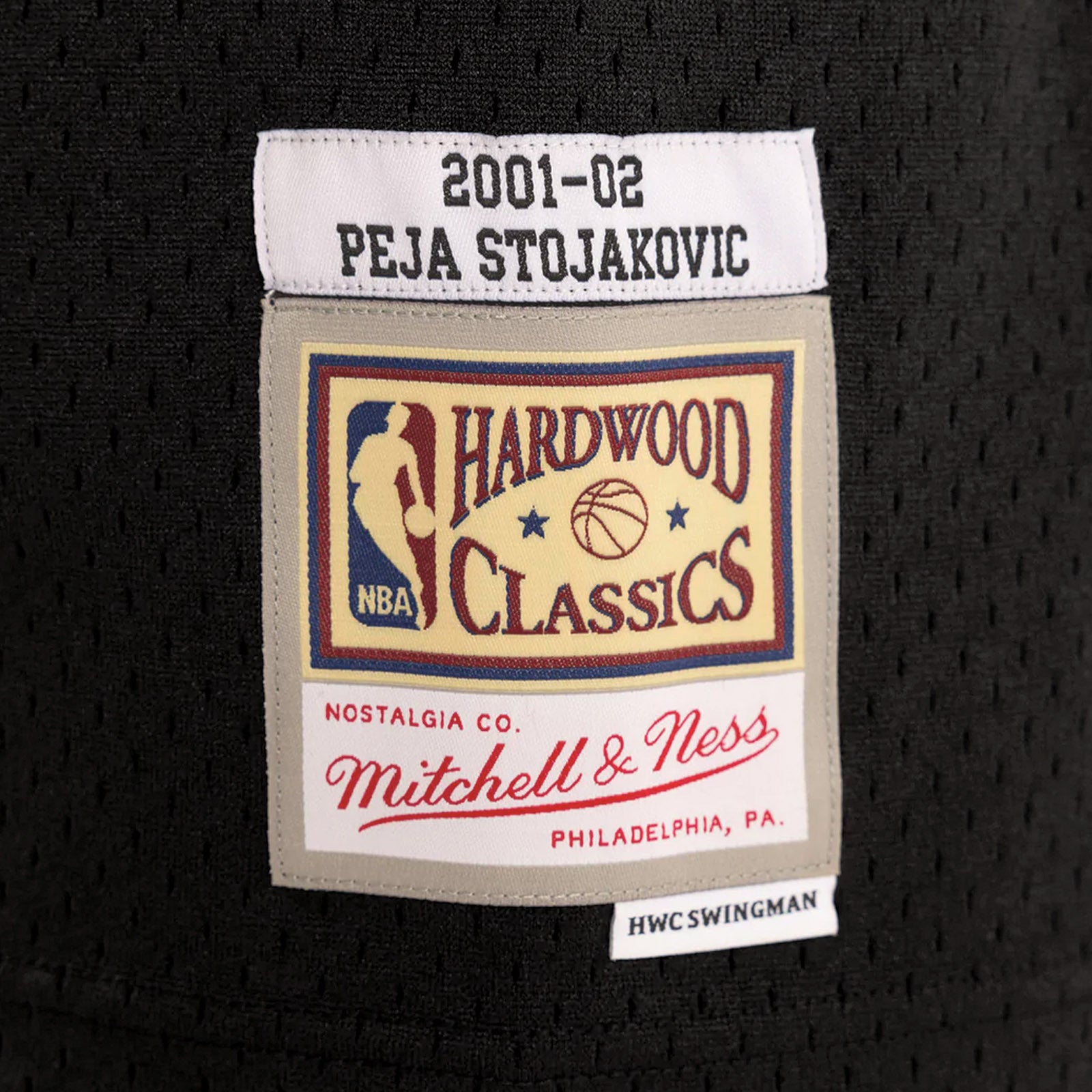 - Mitchell & Ness HWC Swingman woven jock tag and woven label 2001-02 PEJA STOJAKOVIC at lower left front.
