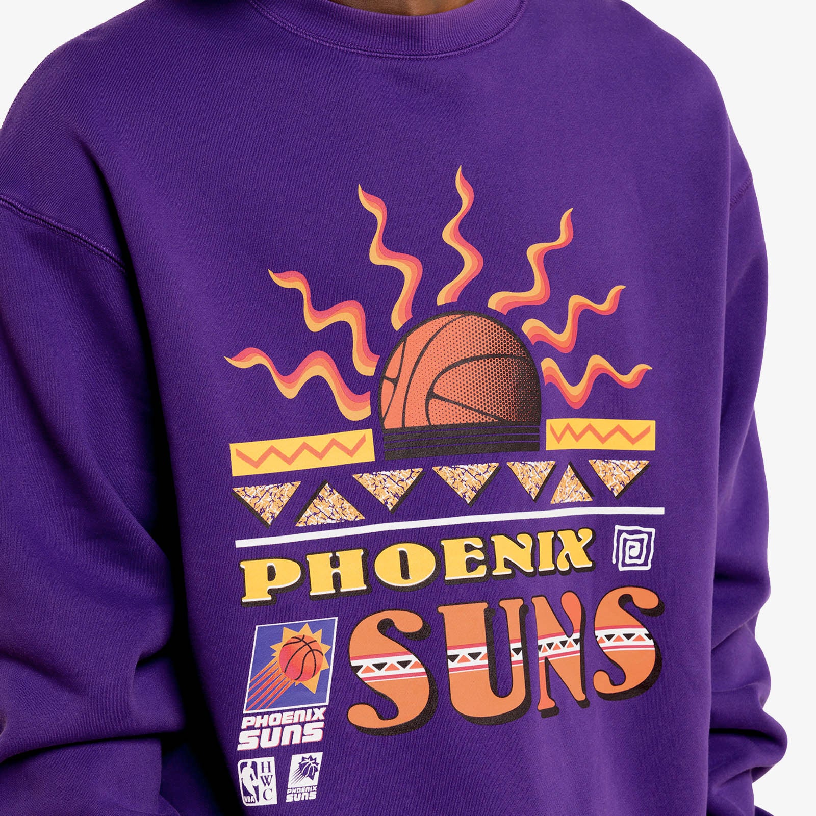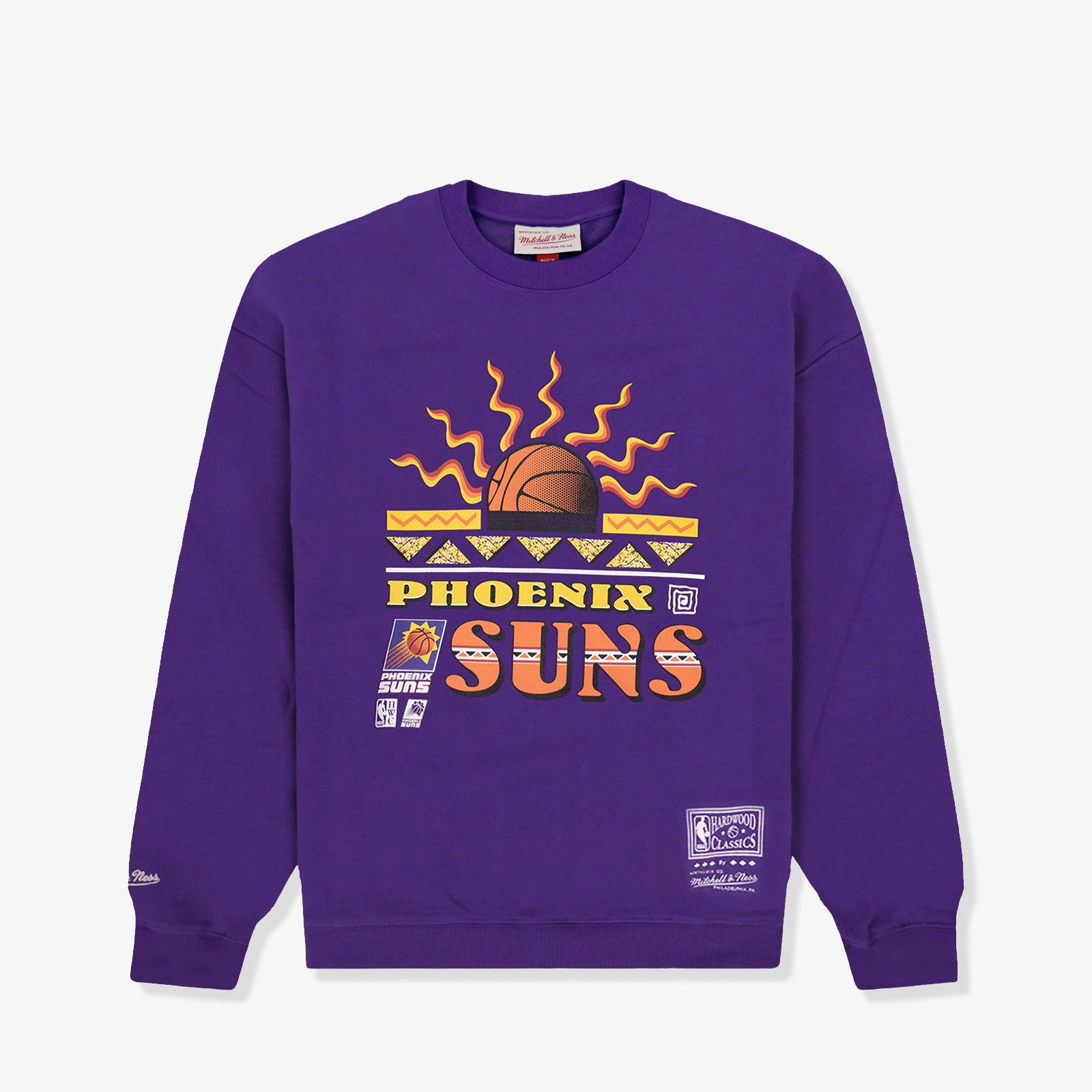 Retro look crew for the Phoenix Suns with aztec-inspired graphics. This Hardwood Classics sweat shirt reps the Charles Barkley era suns which made it to the NBA Finals alongside Kevin Johnson and Dan Majerle.