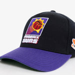 '90s style, swirl print cap repping the Phoenix Suns. In team colours with a purple brim, a "Phoenix" and "Suns" swirl wordmark is featured on either side of the cap.