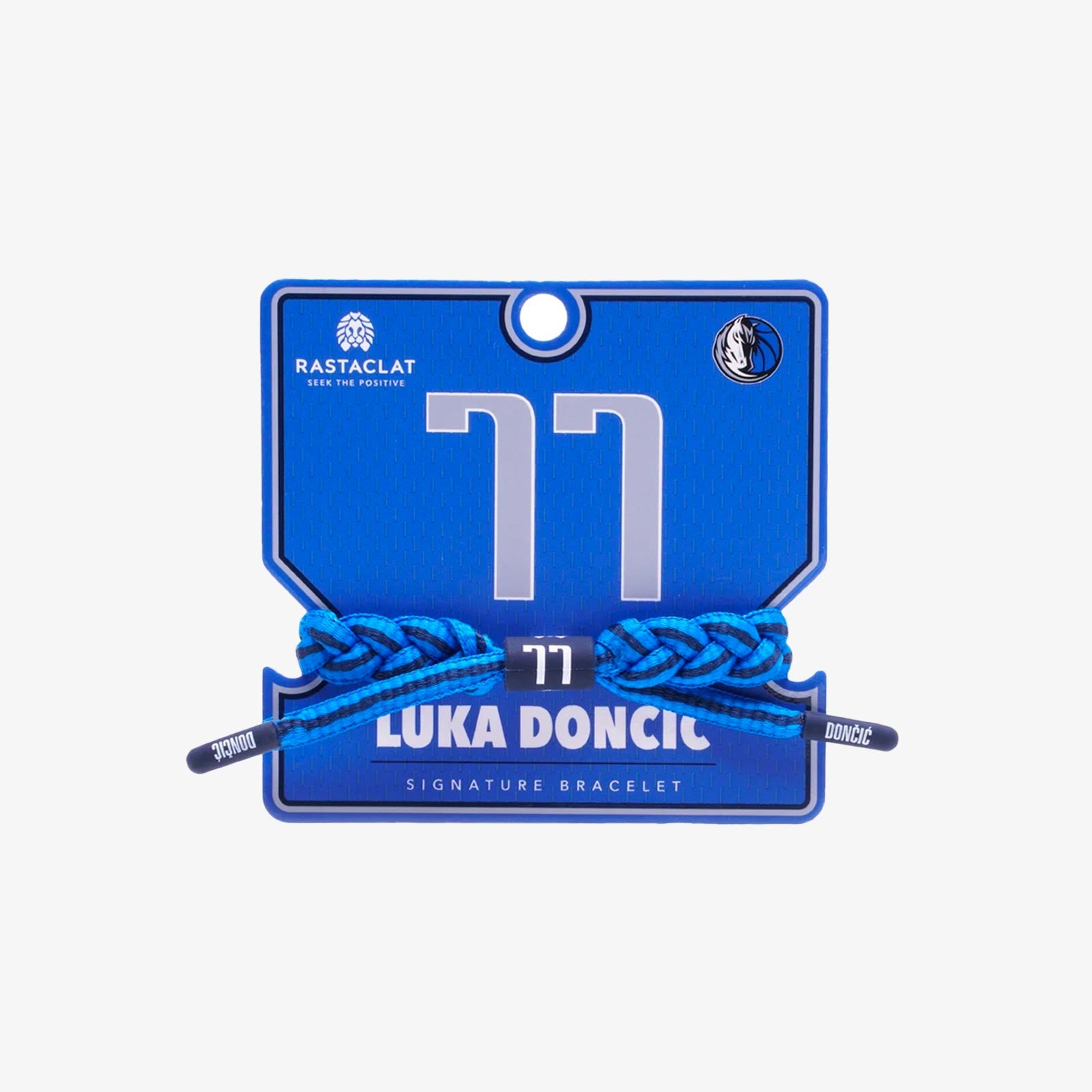 Navy and blue Luka DončIć braided bracelet featuring silicone hardware with player number and team logo.