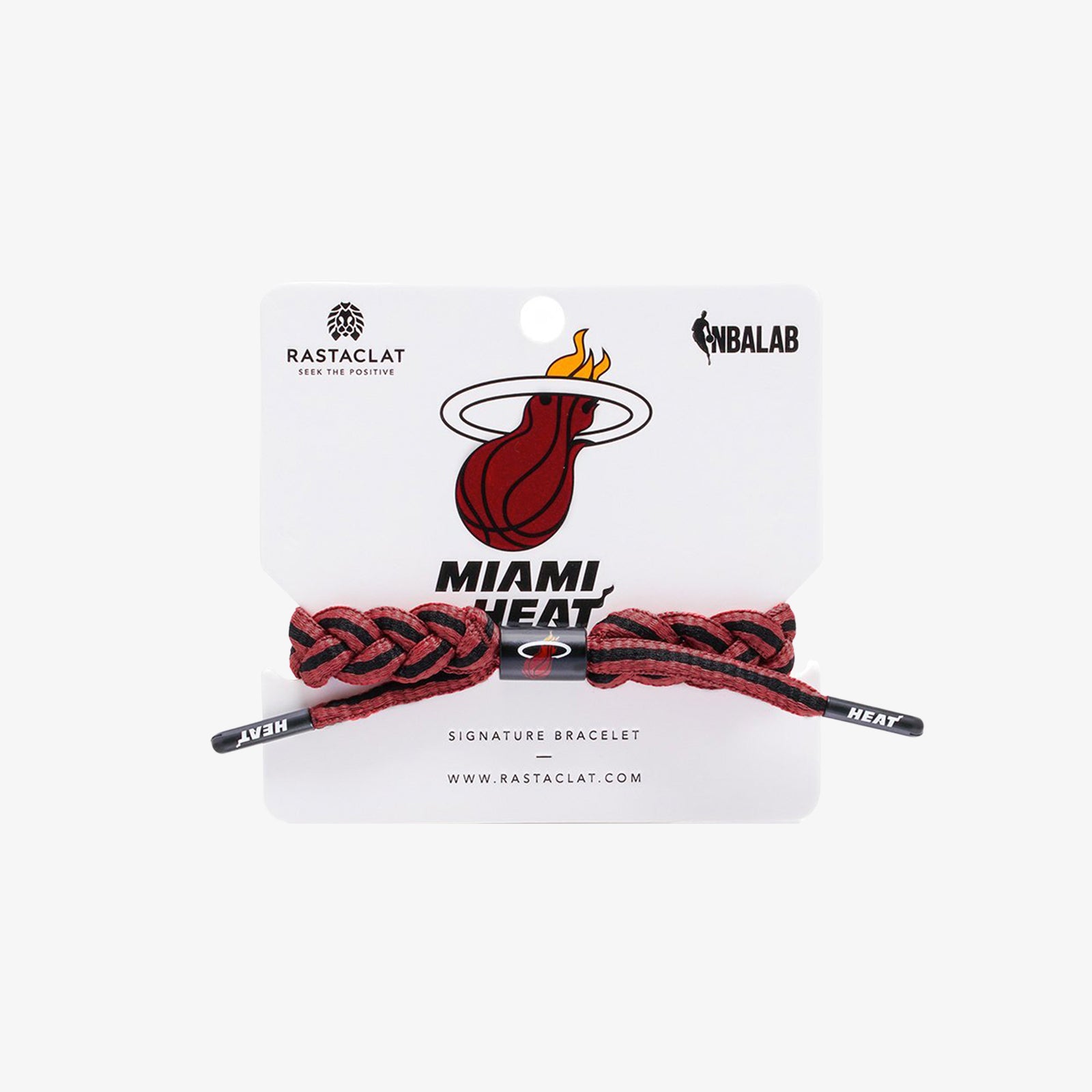 The Miami Heat (Home) Rastaclat NBA Bracelet features a red and black braided bracelet with team logos on the barrel and aglets. This also comes with an exclusive team header card.