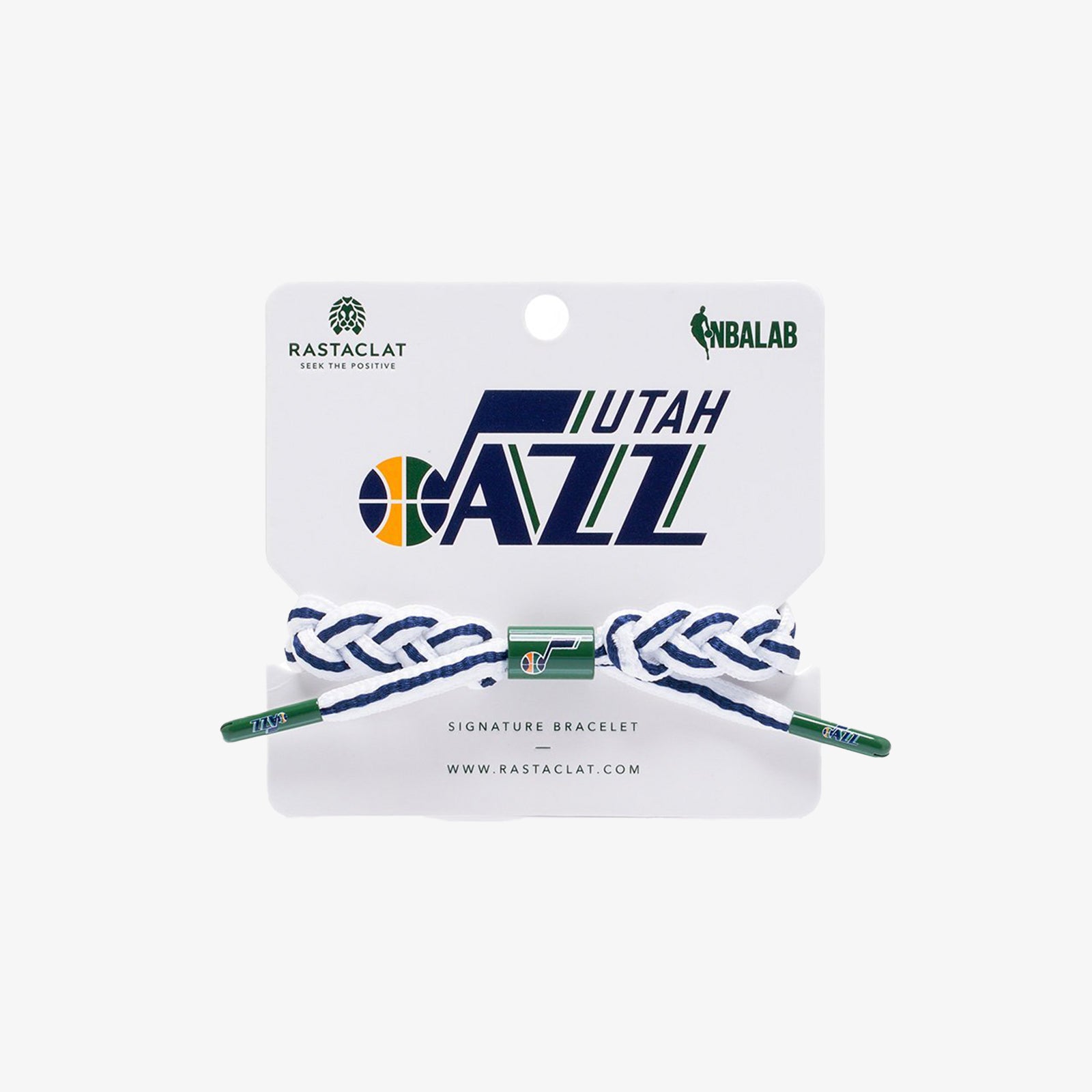 The Utah Jazz (Away) Rastaclat NBA Bracelet features a white and navy braided bracelet with team logos on the barrel and aglets. This also comes with an exclusive team header card.