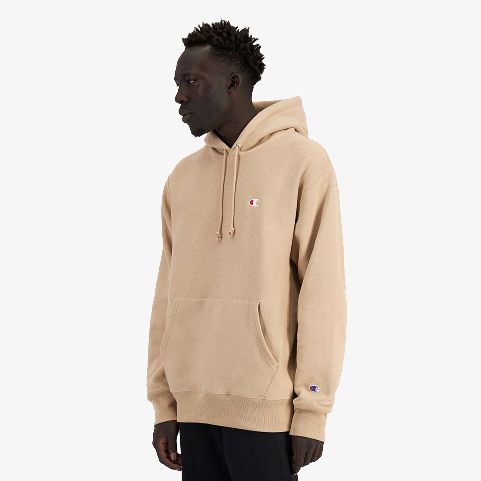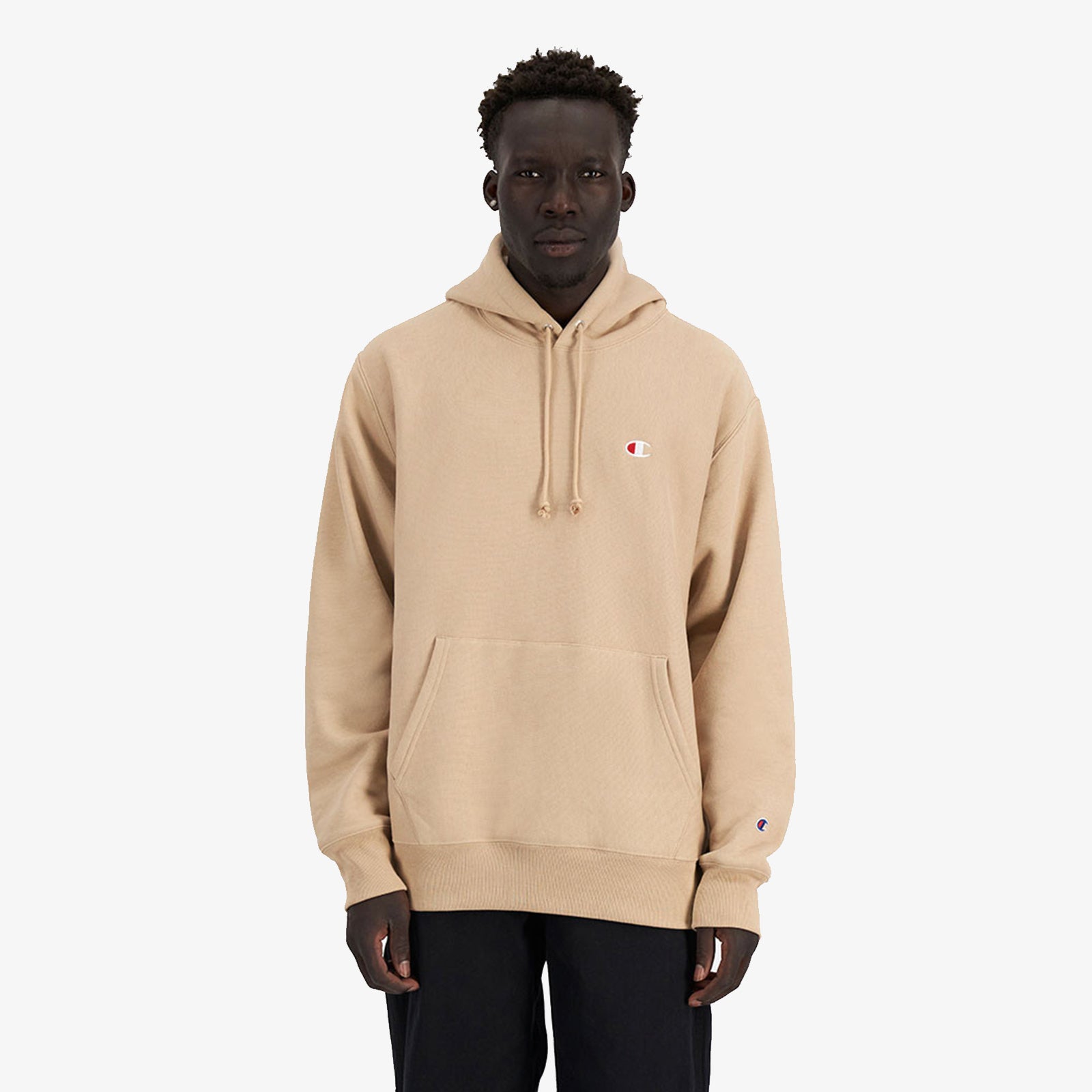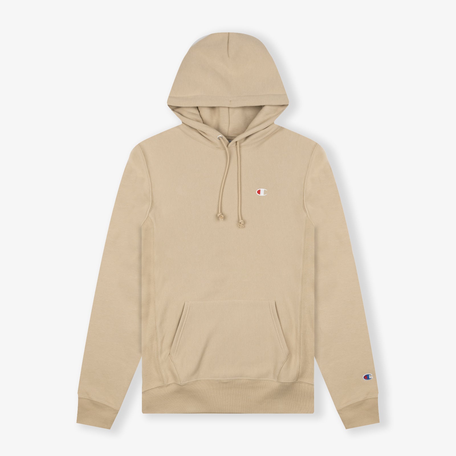 Beige hoodie in Champion's iconic Reverse Weave construction. Your wear everywhere with everything sweat is here in the Reverse Weave Hoodie. This non-shrink sweat blends form, function and fashion in equal measure. The double needle heavyweight fleece hoodie is both durable and cosy.
