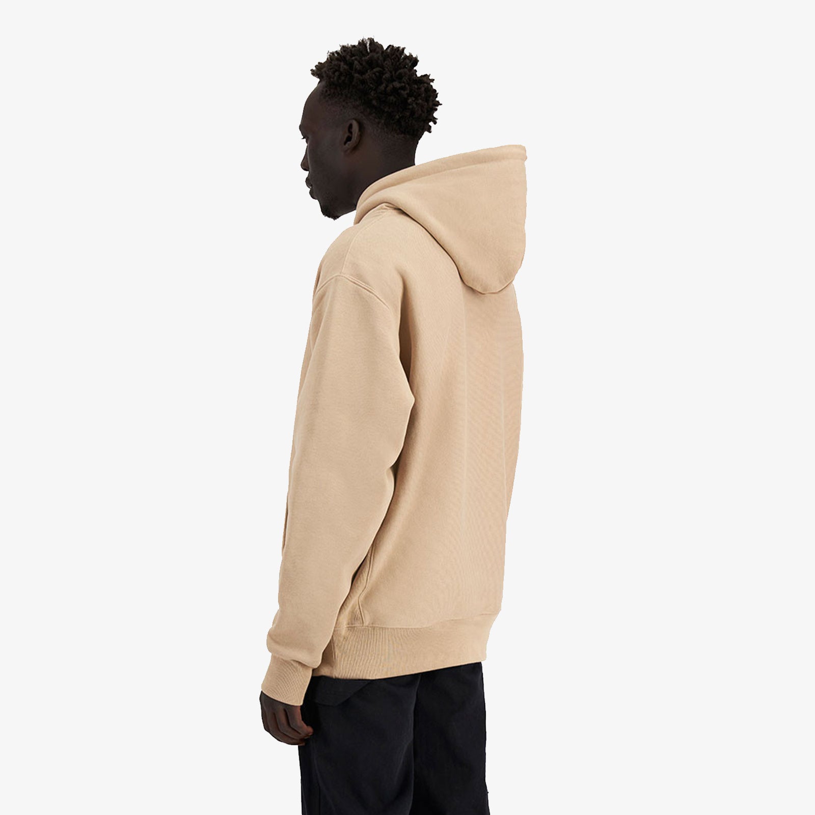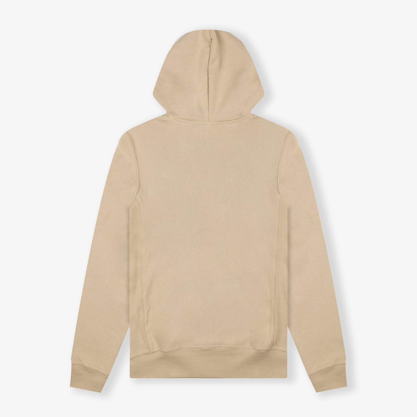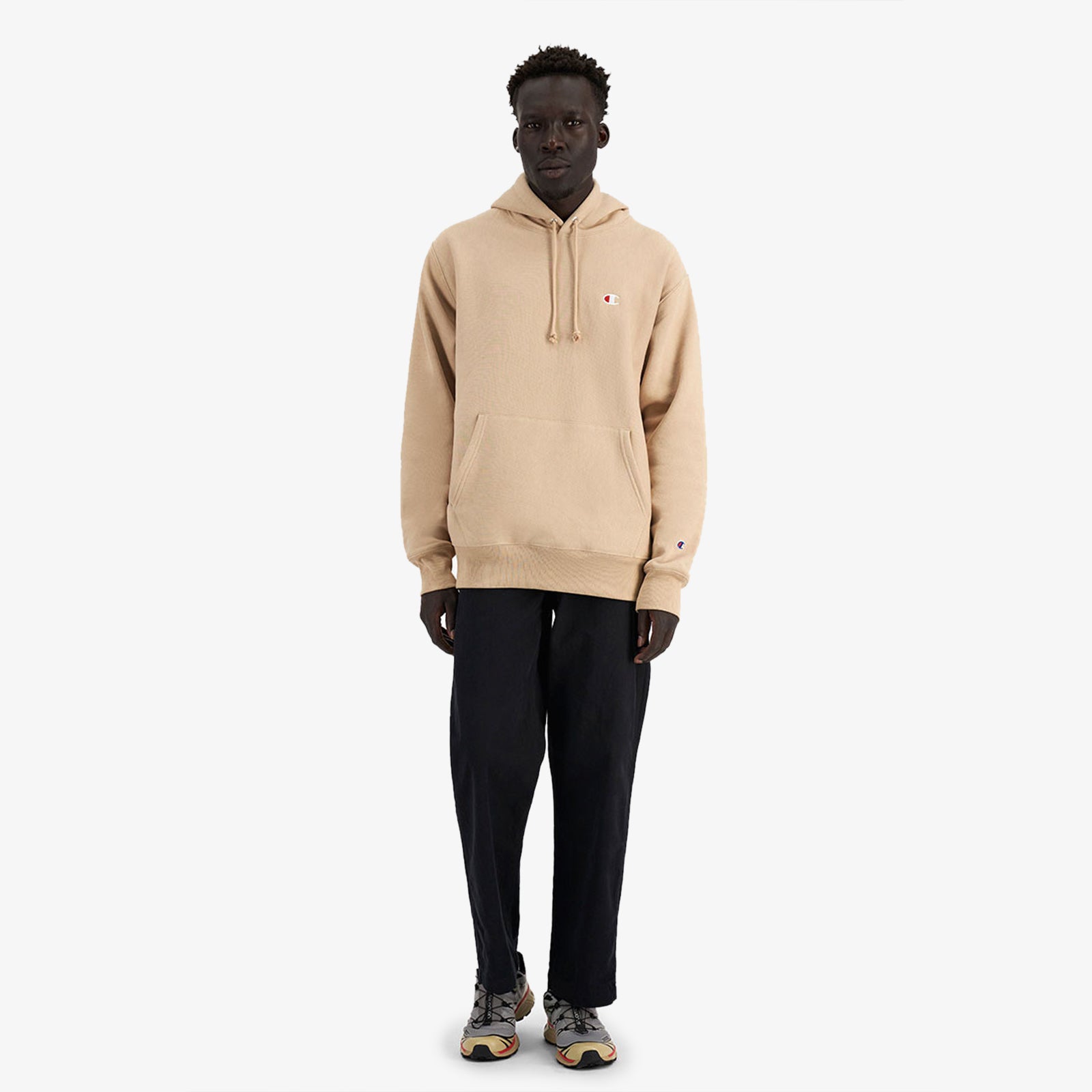 Beige hoodie in Champion's iconic Reverse Weave construction. Your wear everywhere with everything sweat is here in the Reverse Weave Hoodie. This non-shrink sweat blends form, function and fashion in equal measure. The double needle heavyweight fleece hoodie is both durable and cosy.