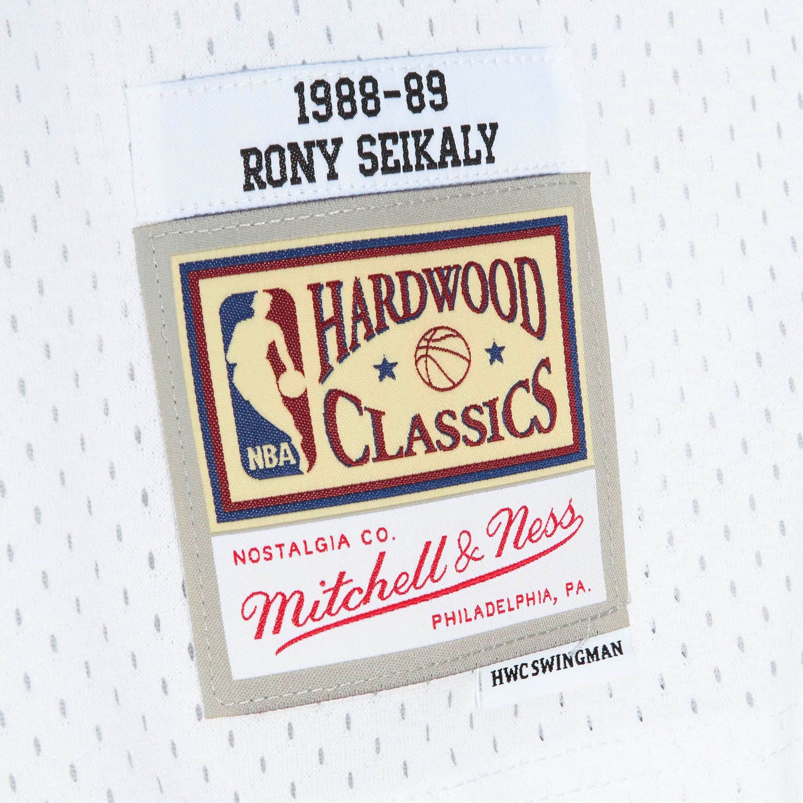 - Mitchell & Ness HWC Swingman woven jock tag and woven label 1988-89 RONY SEIKALY at lower left front.