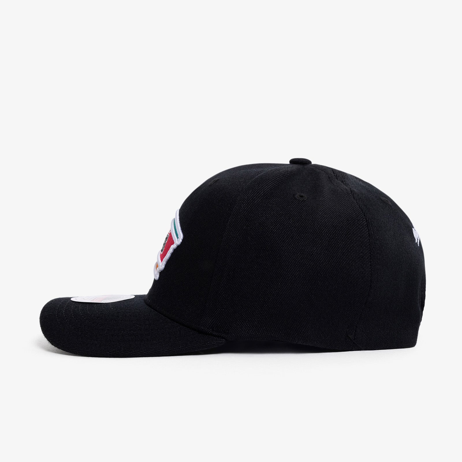 The essential Mitchell & Ness NBA logo snapback. The Classic Red inner band allows for a more comfortable, and universal fit. This all-black custom jacquard is finished out with a stitched red line.