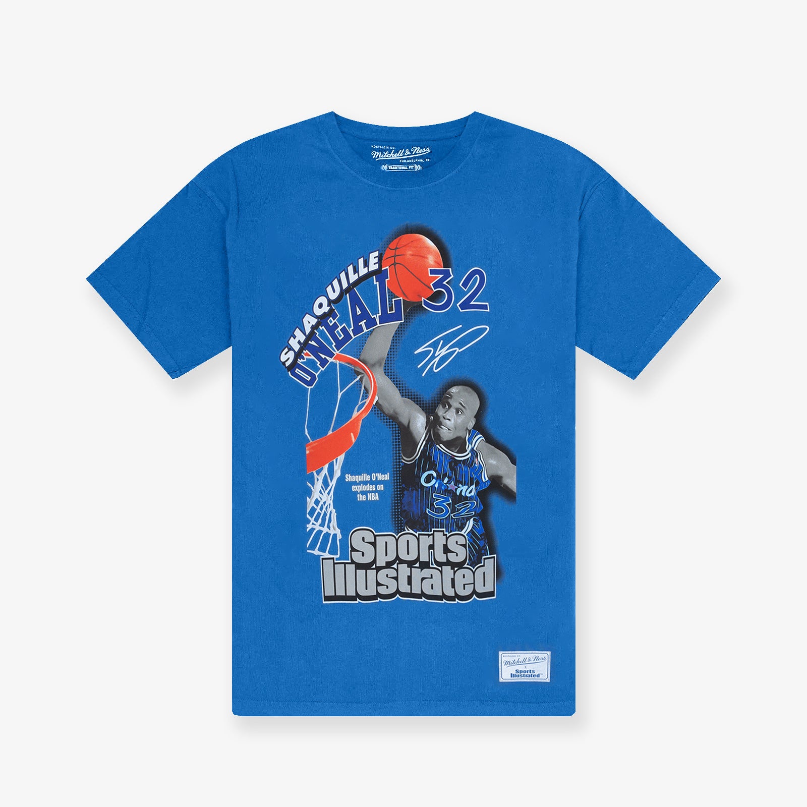 "Shaq!", Shaquille O'Neal's 1992 Sports Illustrated cover immortalised on a tee. Part of the Sports Illustrated x Mitchell & Ness capsule honouring NBA legends and their SI covers.