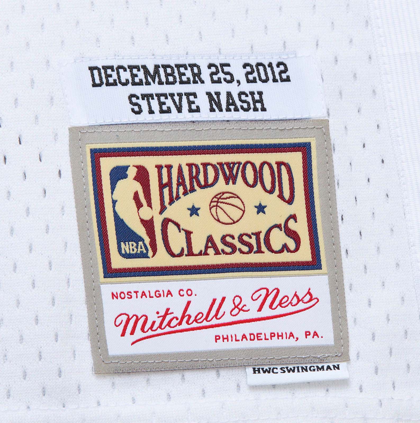 - Mitchell & Ness HWC Swingman woven jock tag and woven label 2012-13 STEVE NASH at lower left front.