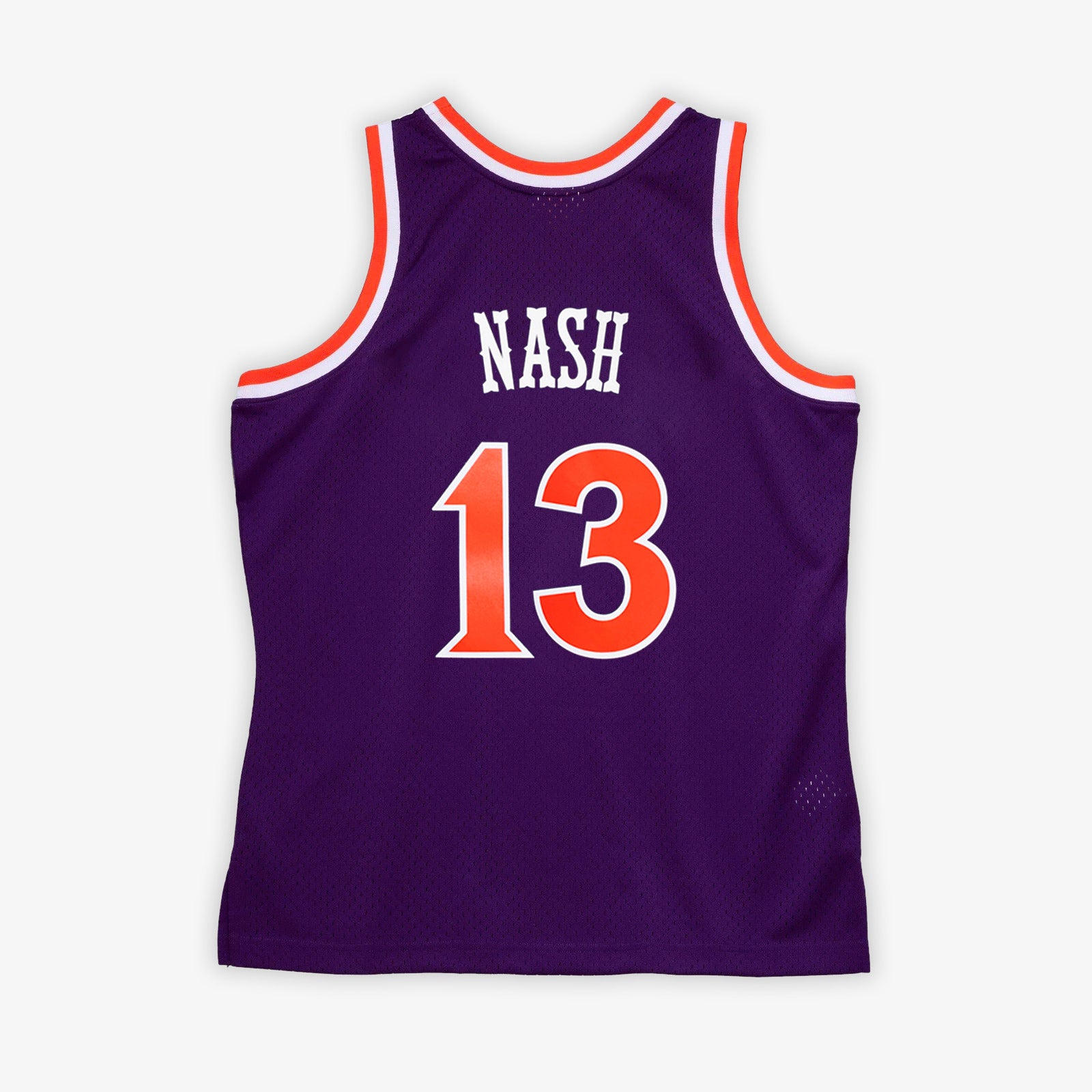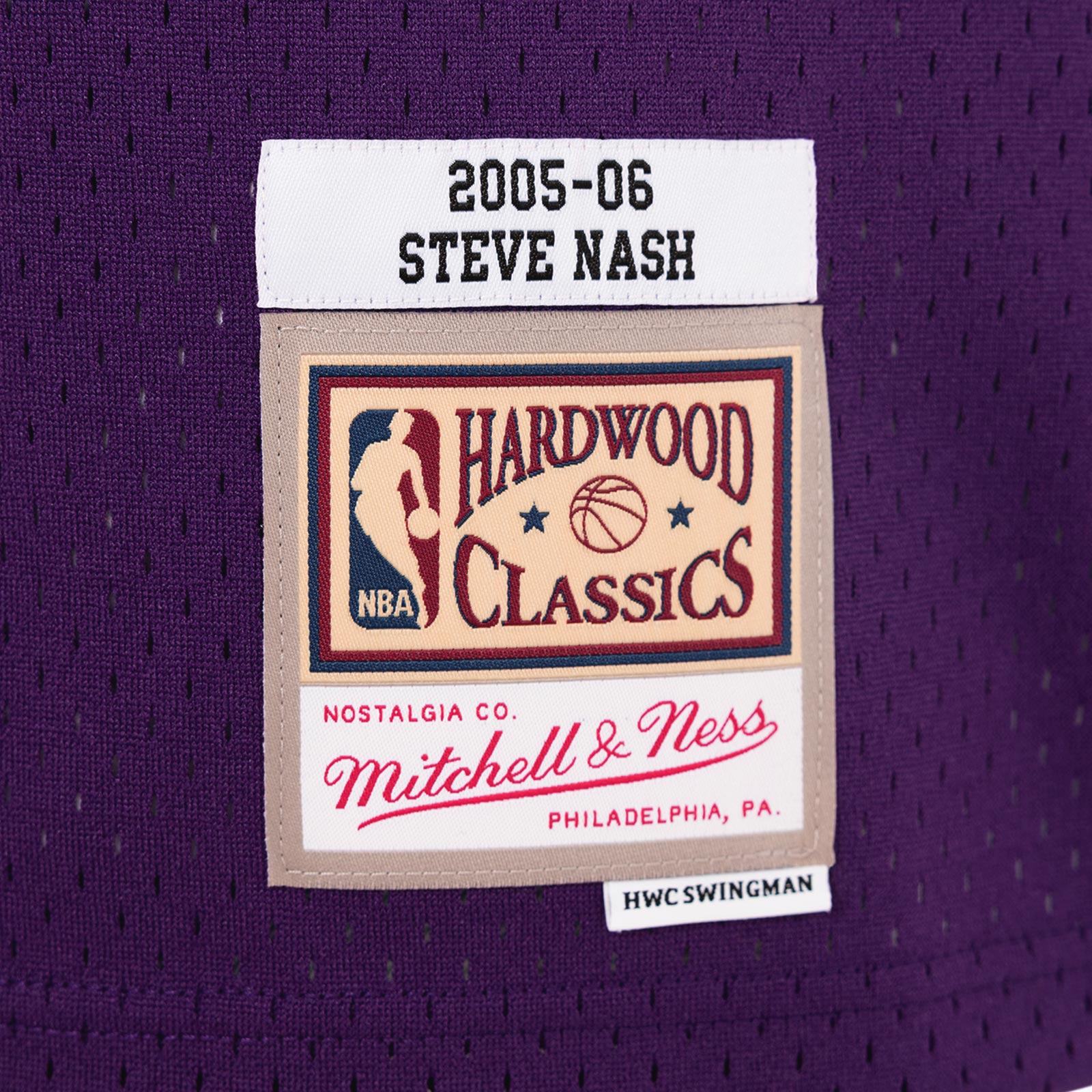 - Mitchell & Ness HWC Swingman woven jock tag and woven label 2005-06 STEVE NASH at lower left front.