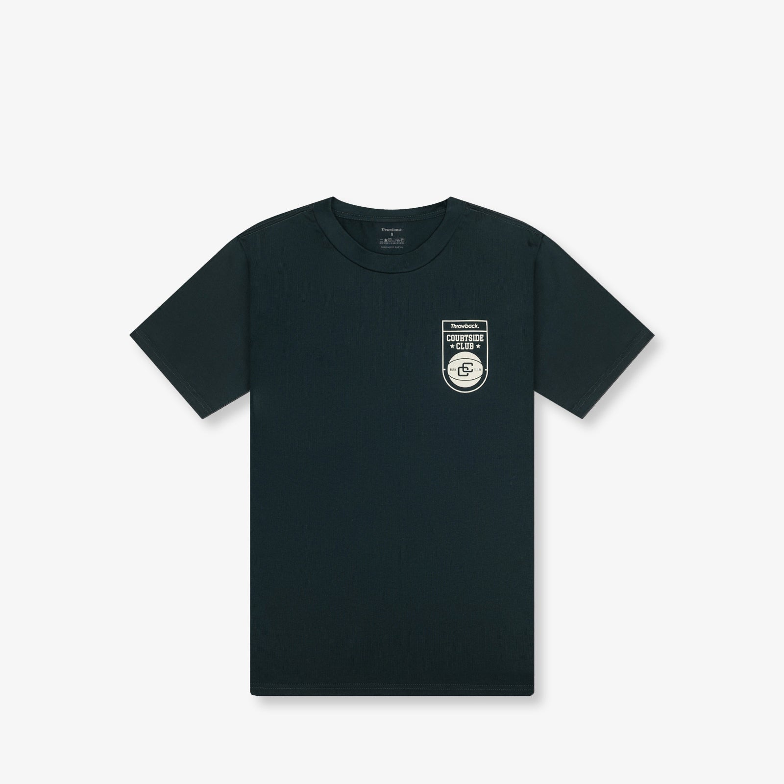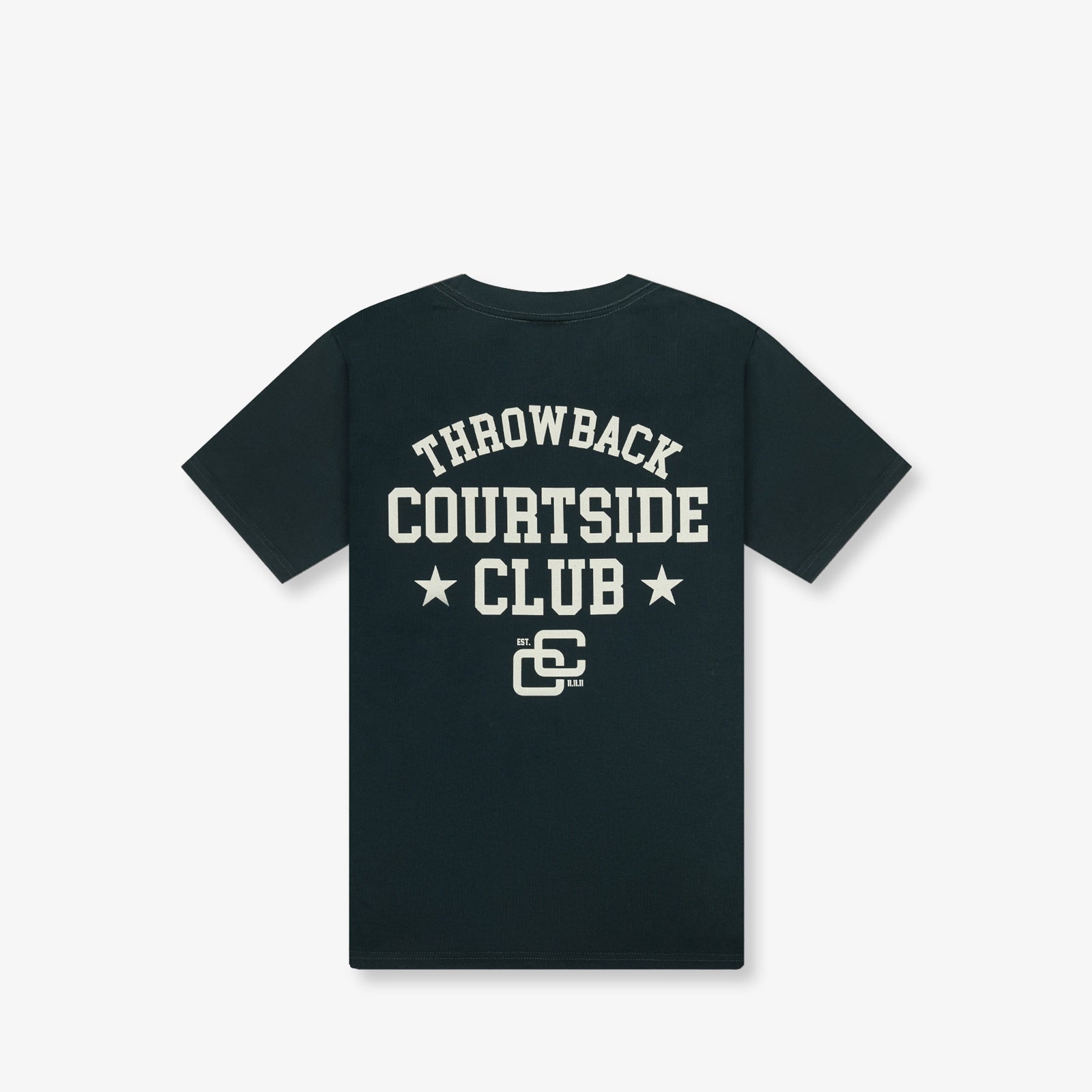 Introducing the Throwback Courtside Club Tee Collection, boxy tees crafted from 100% luxury heavy-weight cotton with a soft finish in an oversized silhouette. This racing tee features a ribbed crewneck collar along with Throwback's Courtside Club crest on the front and a larger design on the back. As seen on Jamal Murray.