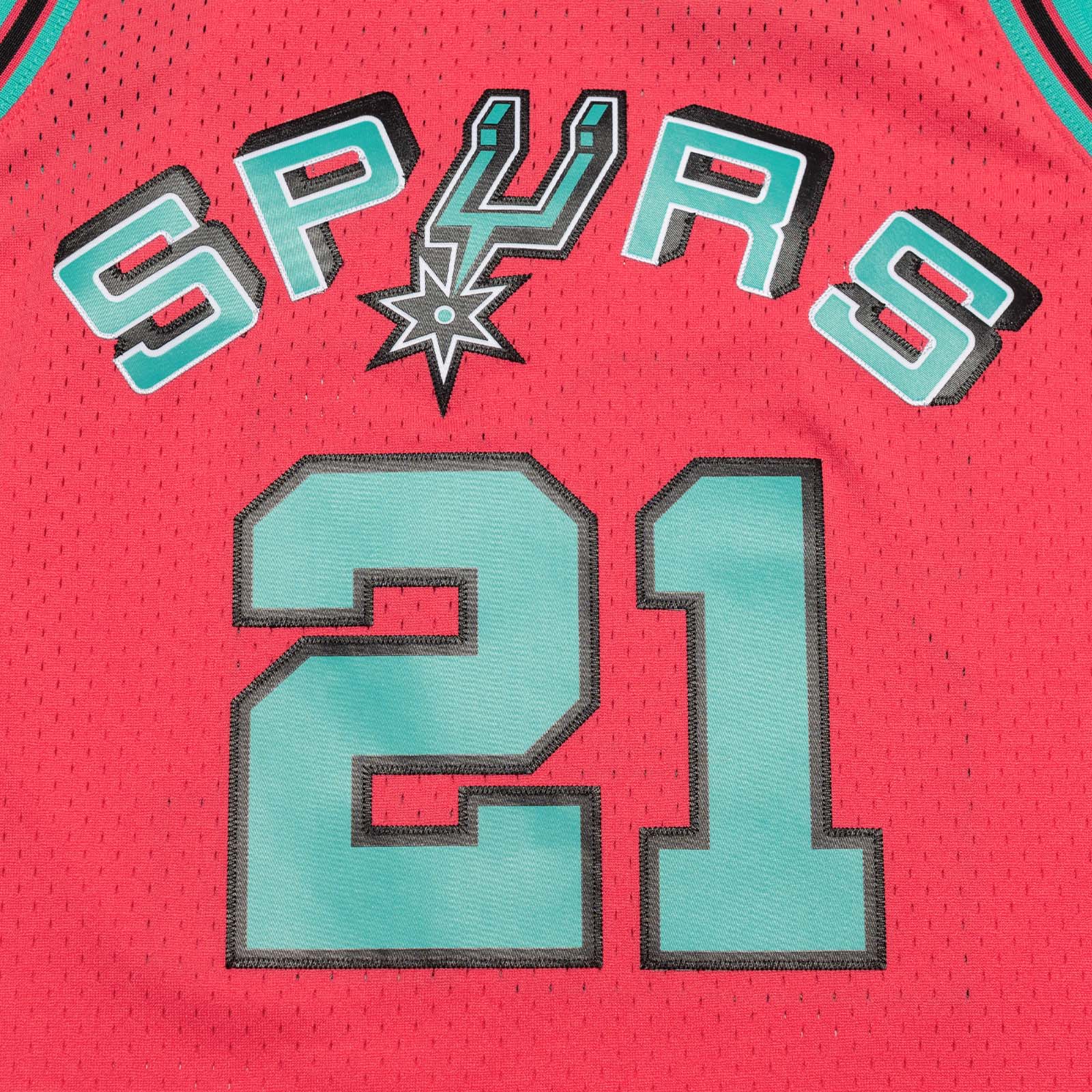 - Mitchell & Ness HWC Swingman woven jock tag and woven label 1998-99 TIM DUNCAN at lower left front.