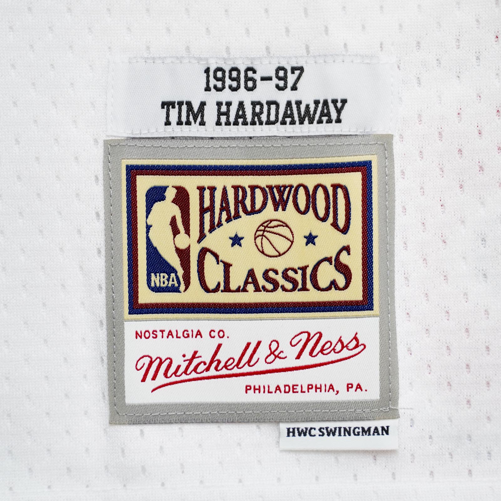- Mitchell & Ness HWC Swingman woven jock tag and woven label 1996-97 TIM HARDAWAY at lower left front.