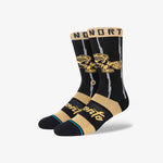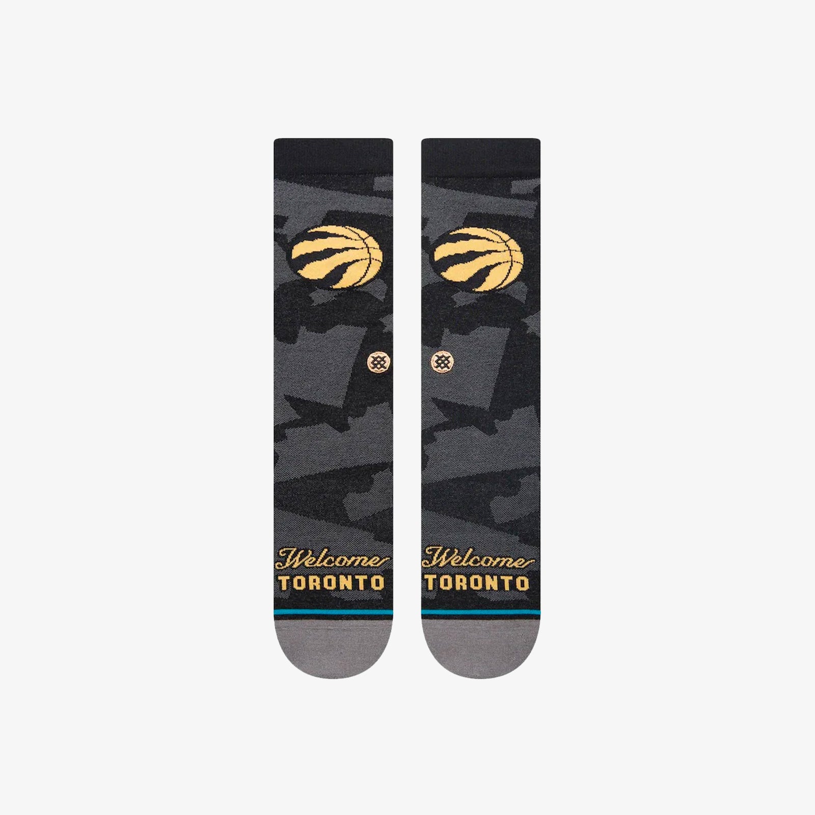 Your 2022-23 City Edition socks for the Toronto Raptors. With classic black and gold styling and subtle details, the Raptors nod to the diversity and unity of Toronto. Toronto’s 6 boroughs are deconstructed to make an embossed, all-over pattern on the base of the uniform.