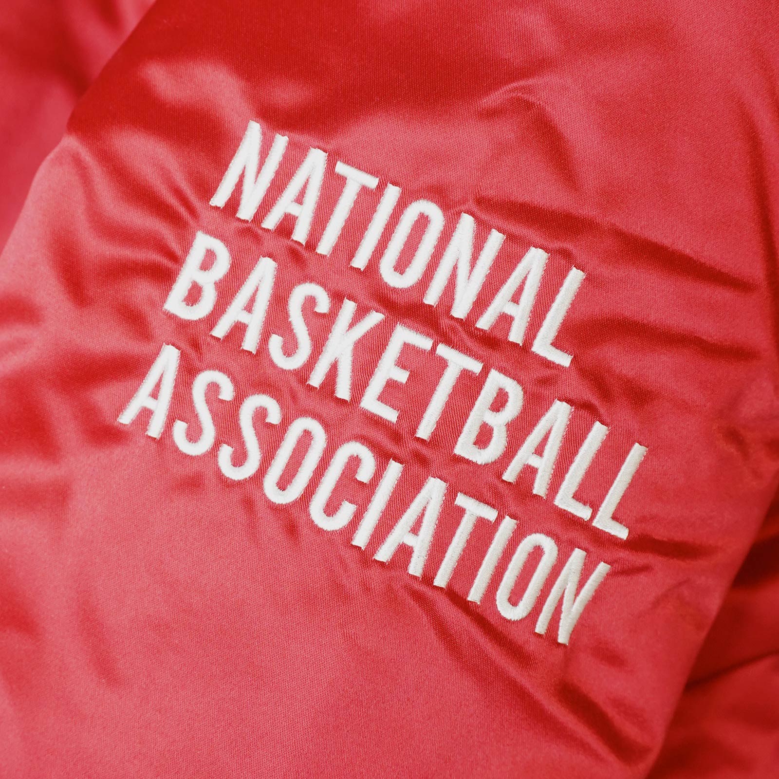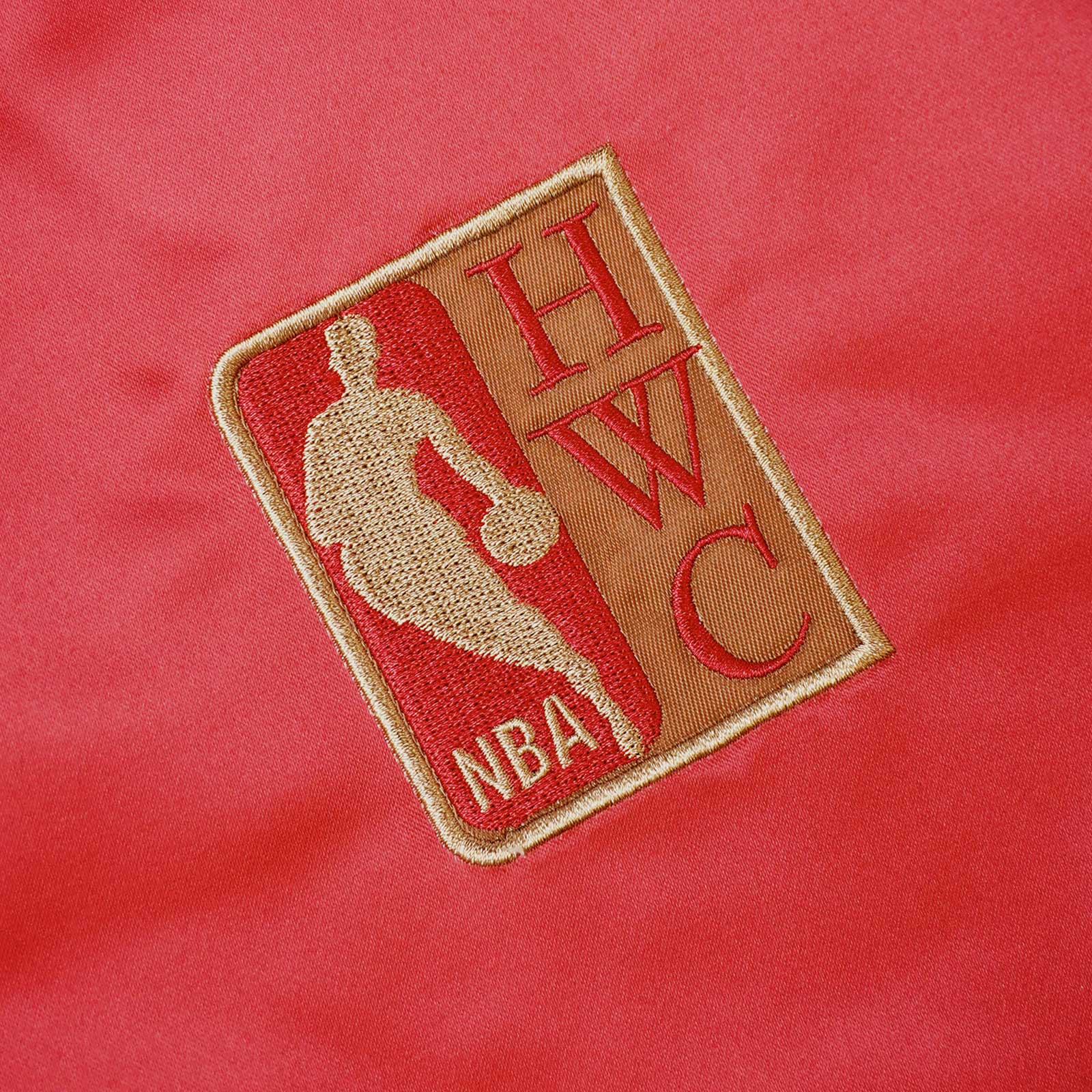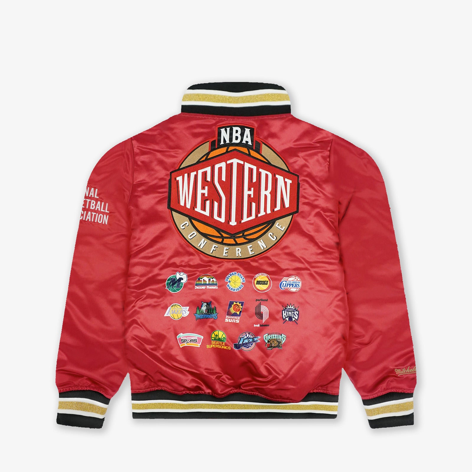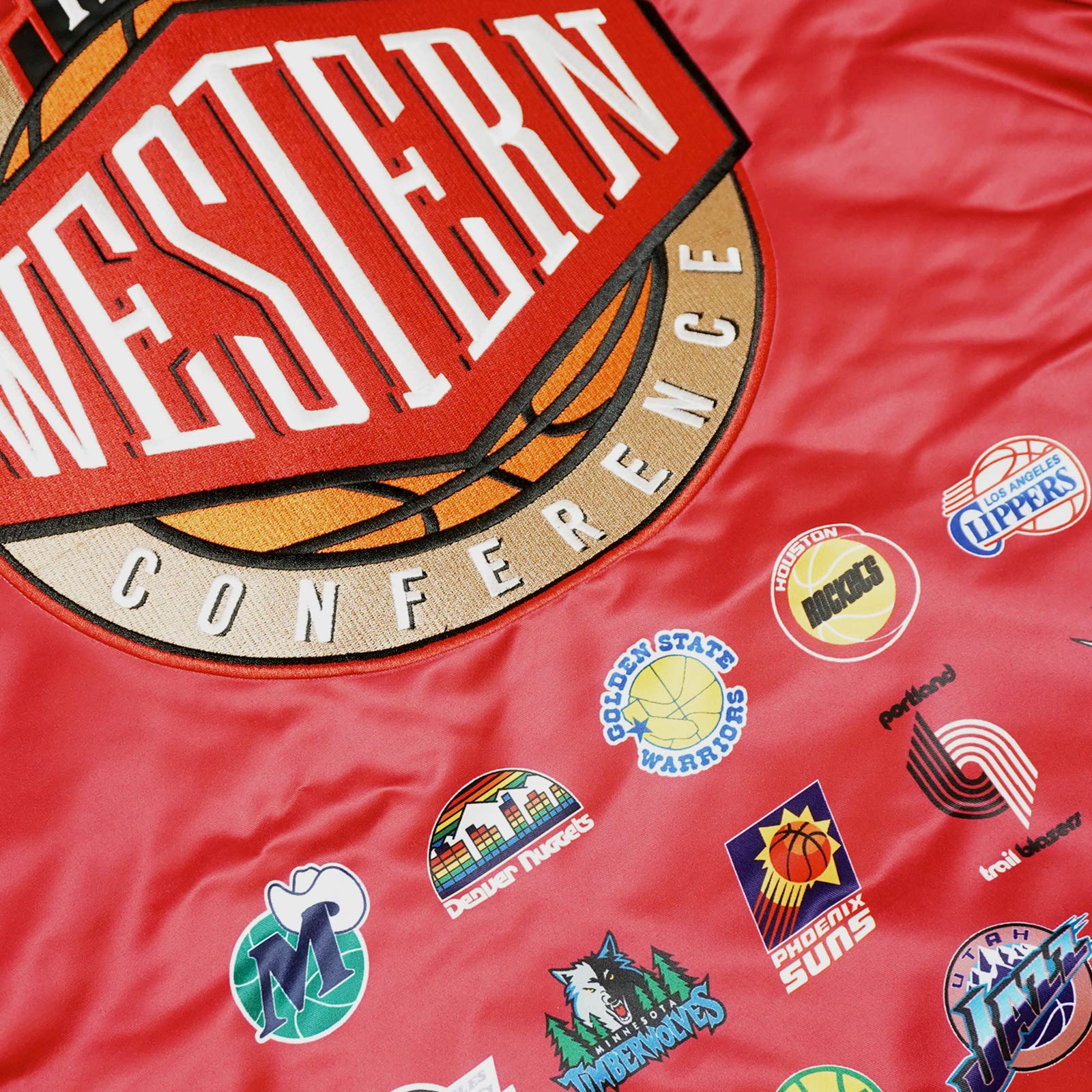 Red varsity bomber jacket for the Western Conference. Repping the '90s West, the jacket features logos from the era of Olajuwon, Barkley, Stockton & Malone. The suite of vintage logos features the now defunct Seattle Super Sonics and Vancouver Grizzlies.